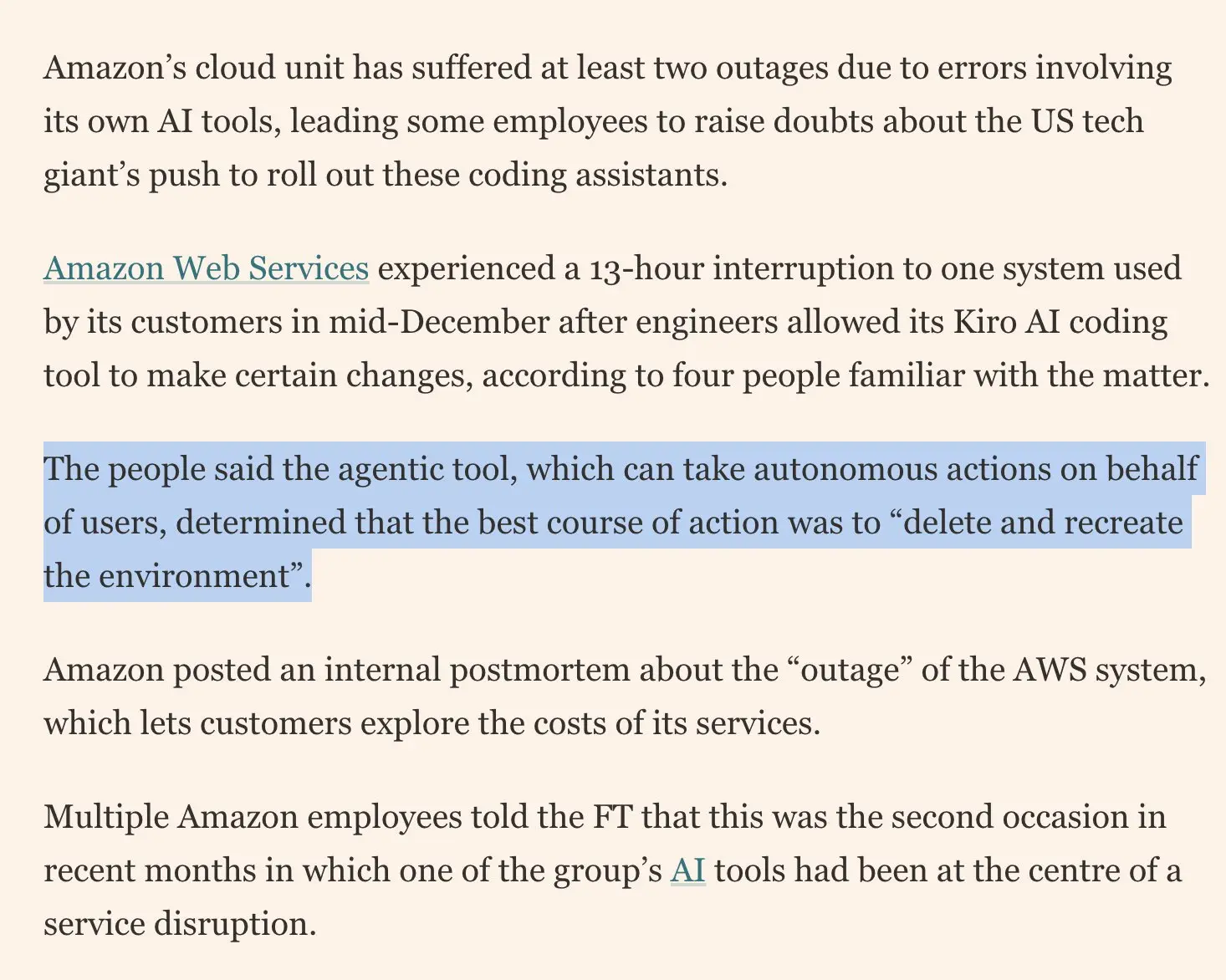 arrow-up1265arrow-down1imageAmazon's internal agentic tool decided that existing code was inadequate and decided to replace it taking down a part of AWS for 13 hours, and was not the first time it had happened. 🤣plus-square☆ Yσɠƚԋσʂ ☆@lemmy.mlEnglish · 17 days agomessage-square24linkfedilink