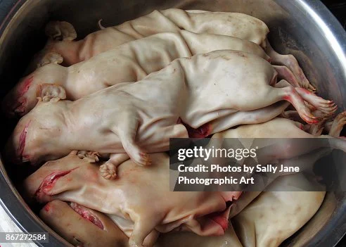 - They’ve been defurred. Because nobody wants a mouth full of hair. Here’s a getty image of more guinea pigs waiting to be eaten. Notice the smooth skin?