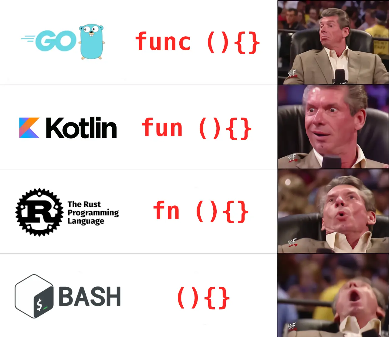 Bash fucks me up so much, too. You just put the parentheses there to say that something is a function, not for actually declaring the parameters that can be passed in…