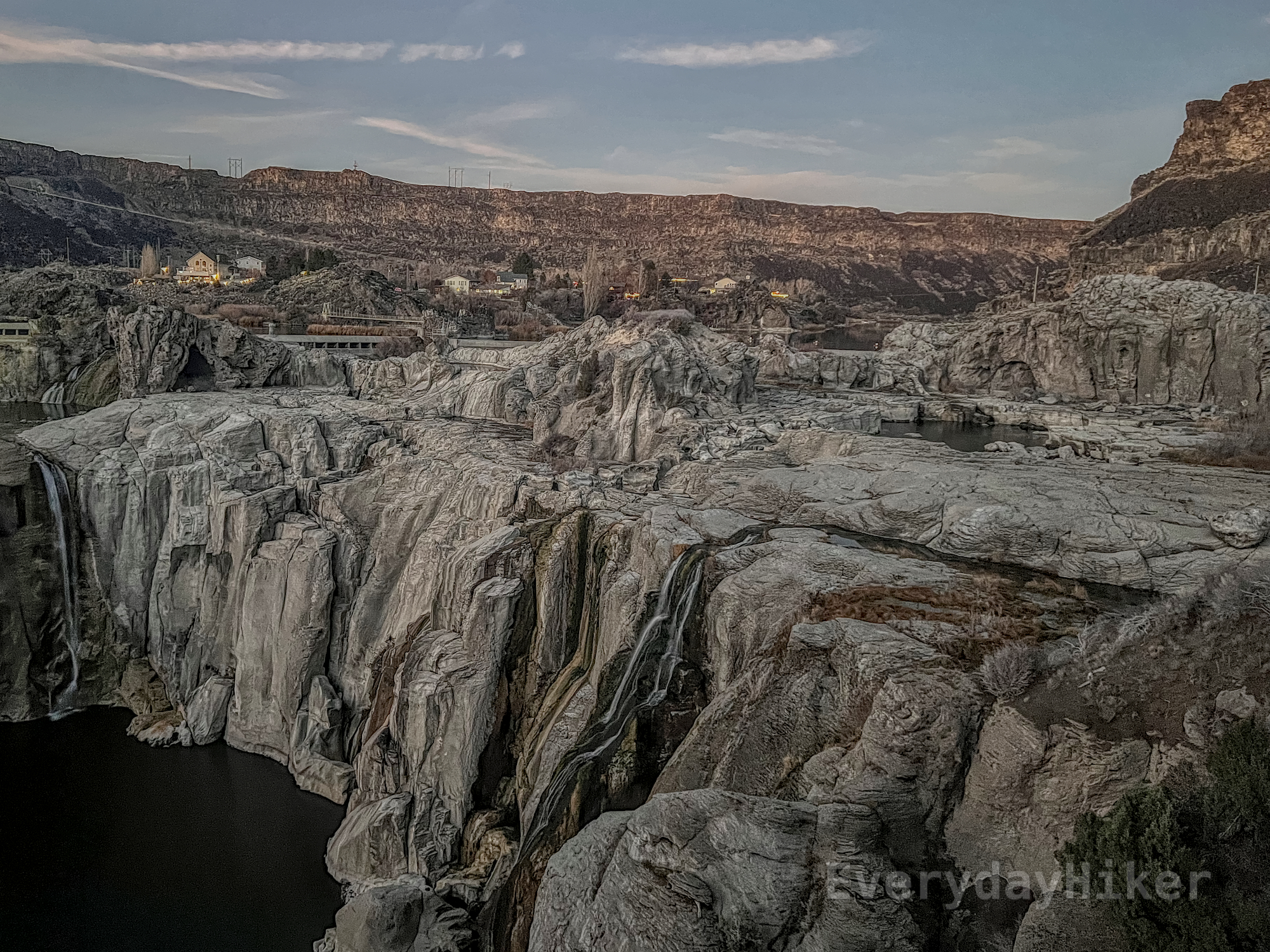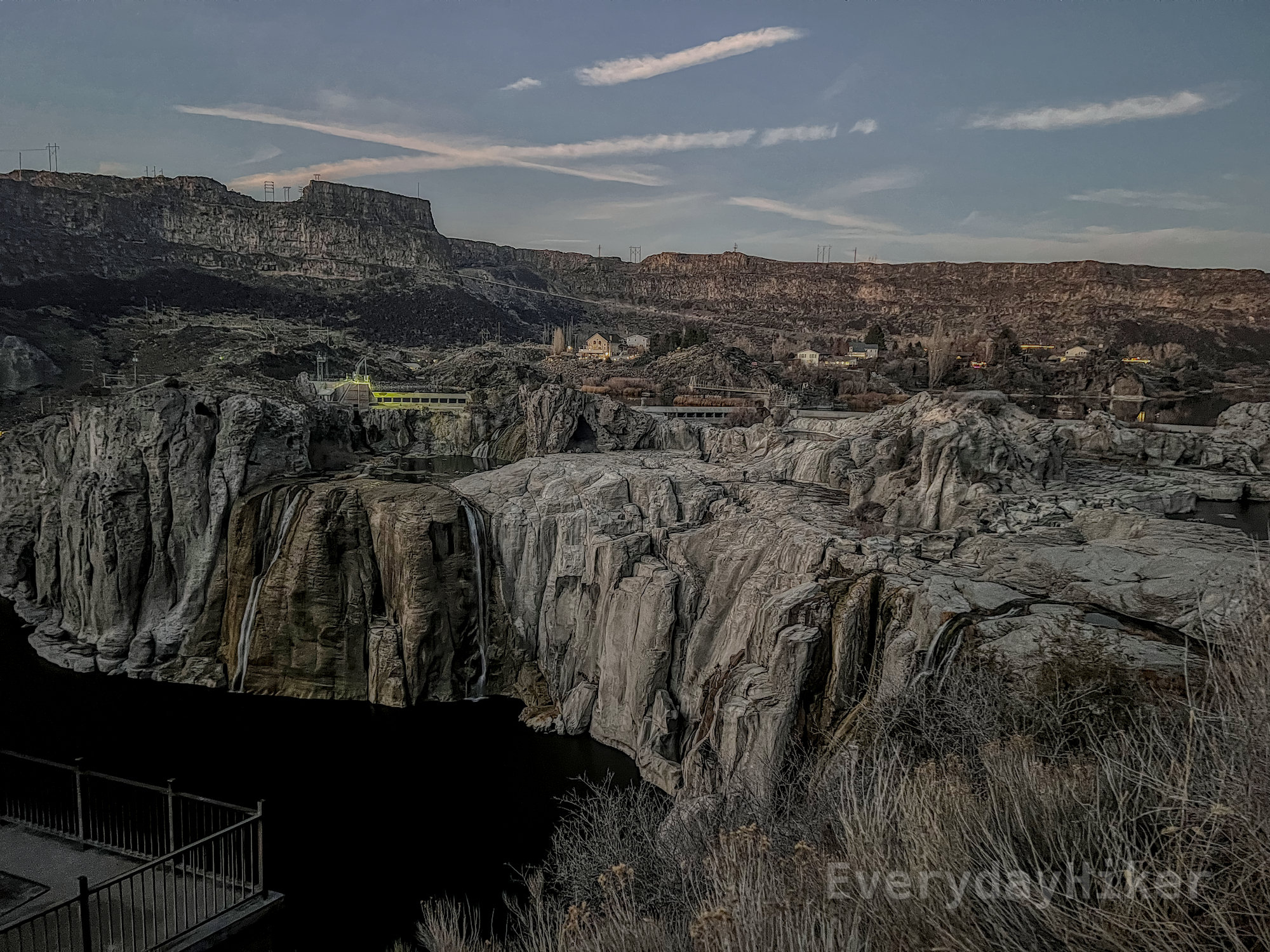 A mostly dry view of Shoshone Falls from one of the viewpoints at dusk. A few waterfalls are present, but the majority of the water has been diverted. Infrastructure as well as the town of Twin Falls may be seen in the background along with a few streaks of clouds.