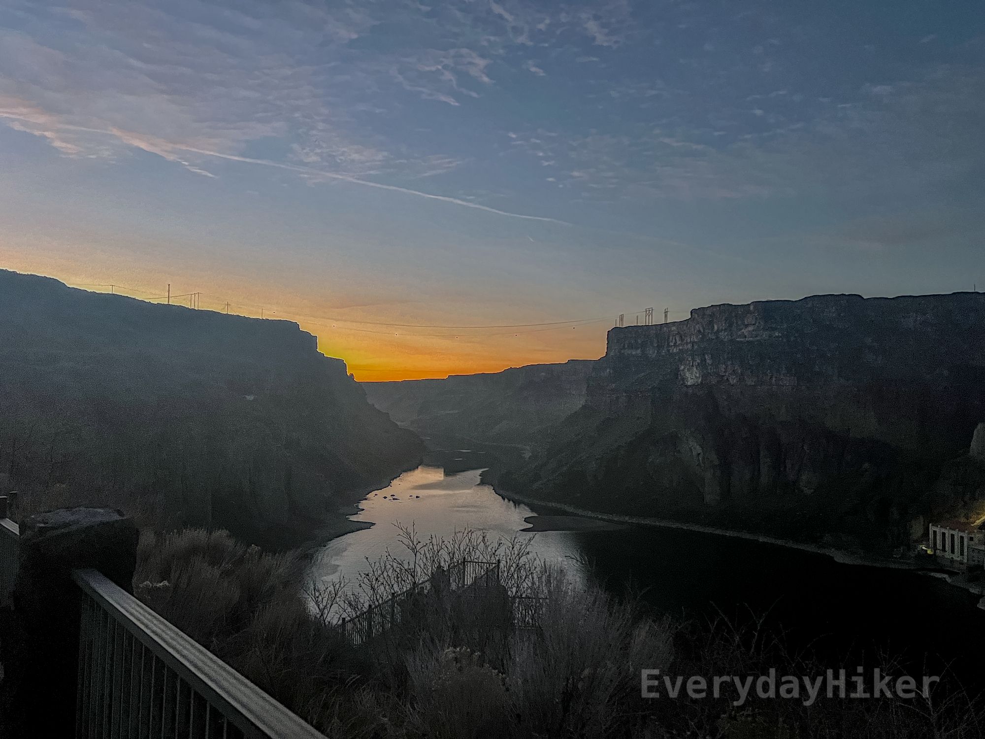 Looking downstream from one of the viewpoints as the sunsets. The Snake River may be seen between two large canyon walls. Orange glows just above the canyon walls leading to a partially clouded blue sky.