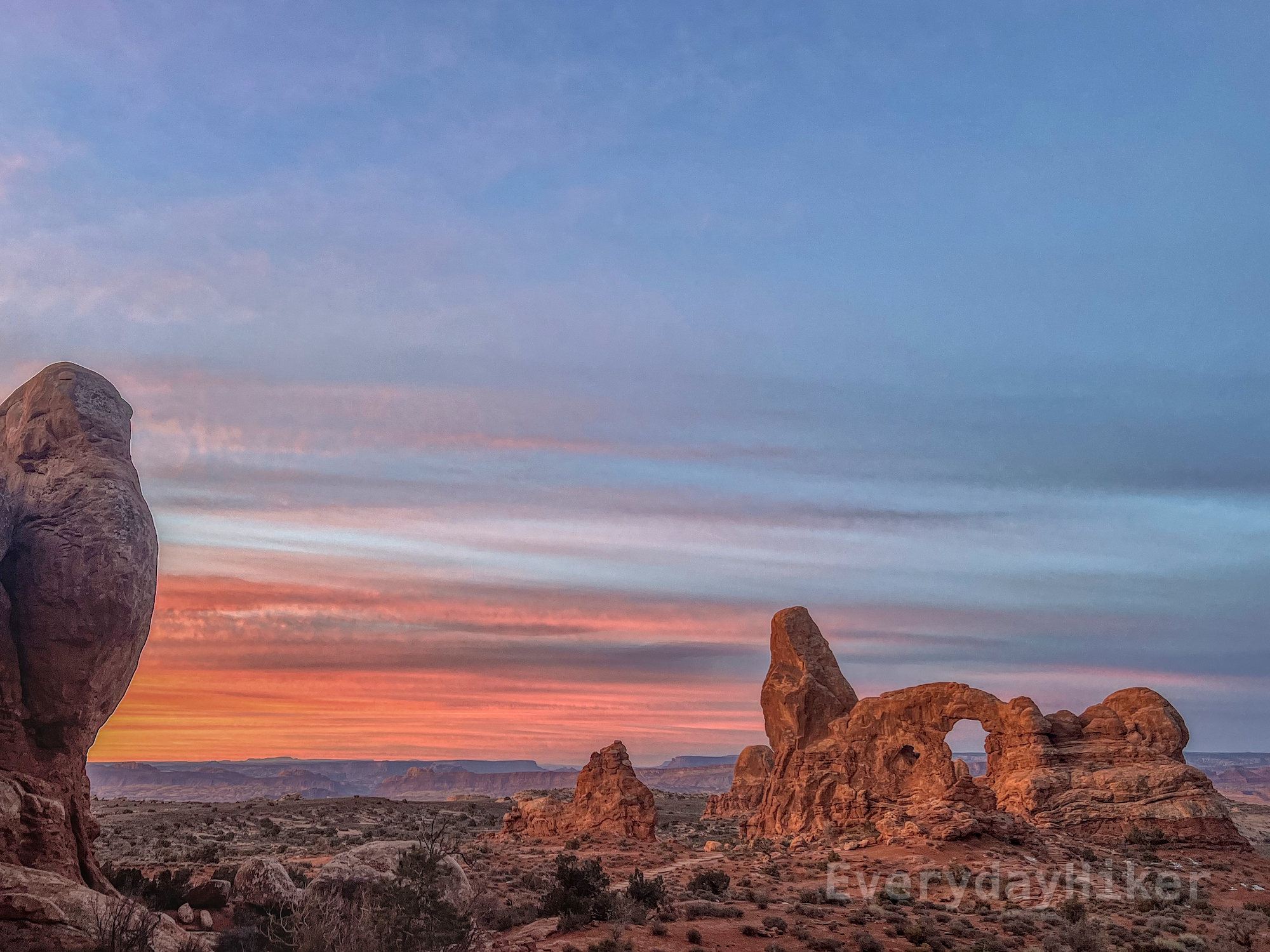 A fantastic short hike that takes you to two large window arches as well as the castle-like Turret Arch structure in Arches NP. Great location for sunrise viewing as you both see the distant mountains lit up in vibrant colors or watch Turret Arch through the North Window. Rock stairs could be slick.