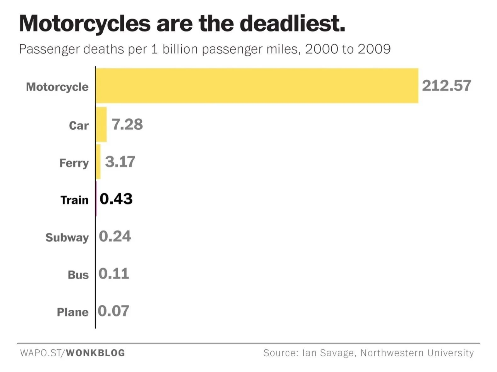 I’d be interested to know if motor scooters/Vespas were lumped in with motorcycles. I’d wager a 99cc scooter has a lower mortality rate than a crotch rocket or a Harley.