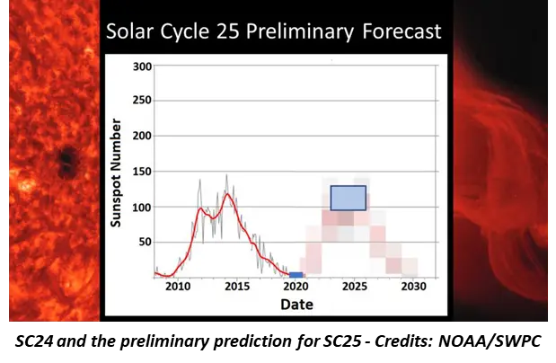 The new cycle is expected to start late in 2019 or in 2020, with solar maximum to be reached between 2023 and 2026 and the maximum (smoothed) sunspot number in the 95 to 130 range.