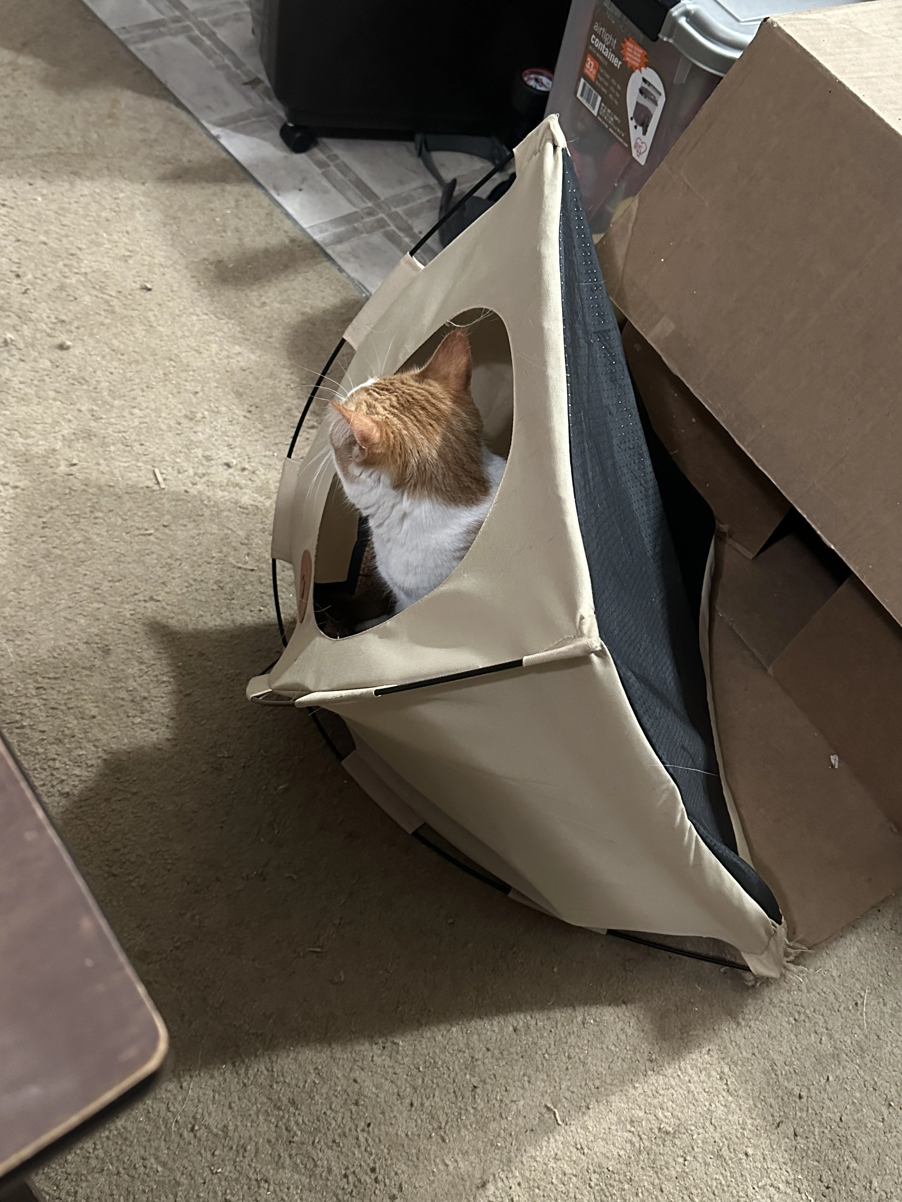 She has a cat tent, it sits on top of the box in the background, Mouse loves to jump into the tent and knock it over and then hide in it.