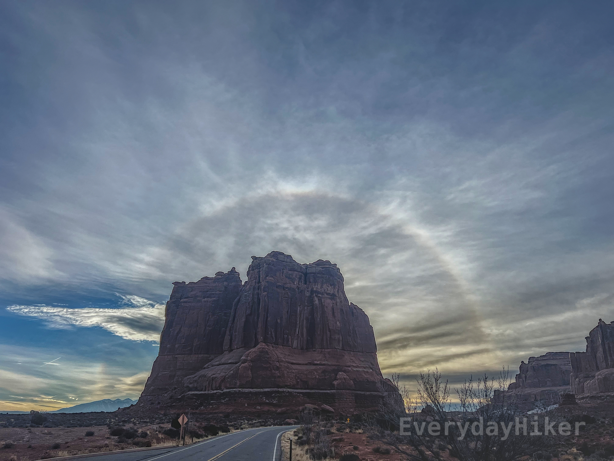 A massive block of rock rises above the main road in Arches National Park, surrounded by a sunbow on a chilly morning. I believe the slab was actually The Organ, which is across the road from the turnaround for the trail if hiking.