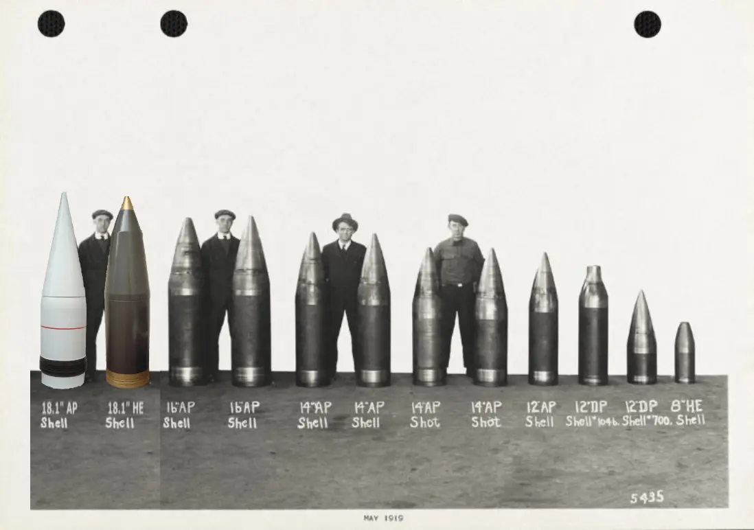 I don’t know much about Helldivers, but the Wiki says their artillery are 360mm, which is closer to 14 inch shells. Slightly smaller than the thread pic. The right two here: