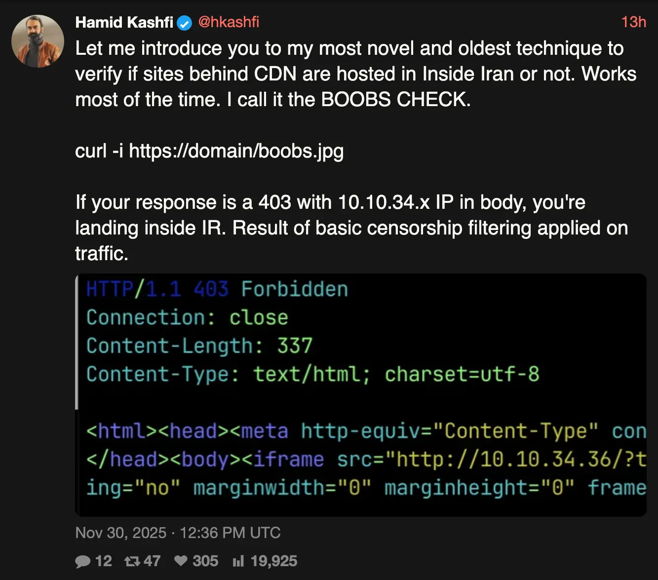 arrow-up1380arrow-down1image"Boobs check" verify if sites behind CDN are hosted in Inside Iran or notSundray@lemmus.org to Mildly Interesting@lemmy.worldEnglish · edit-22 months agomessage-square45linkfedilinkfile-text