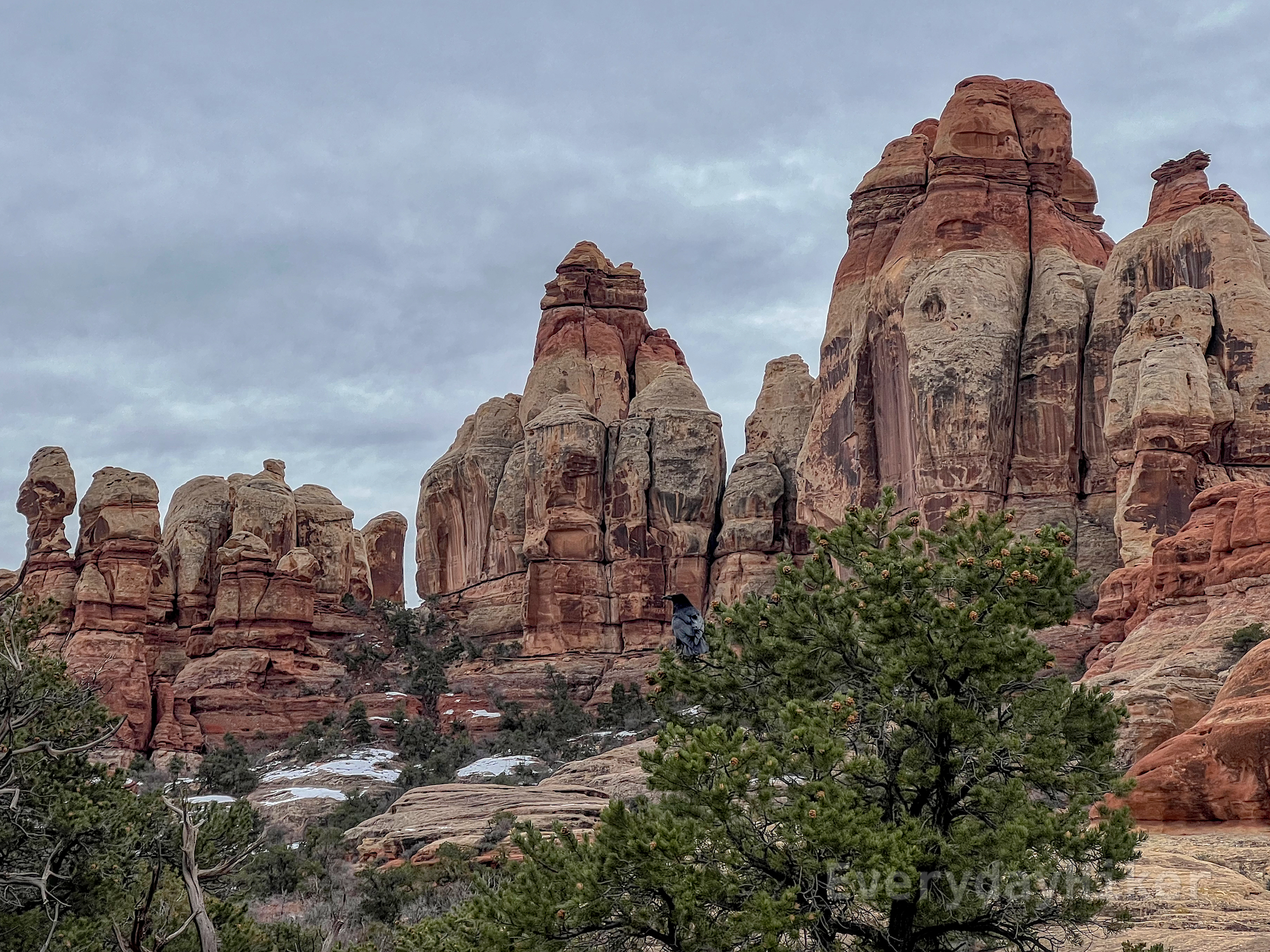 A crow sits on a small tree with several sandstone pillars/needles behind it.