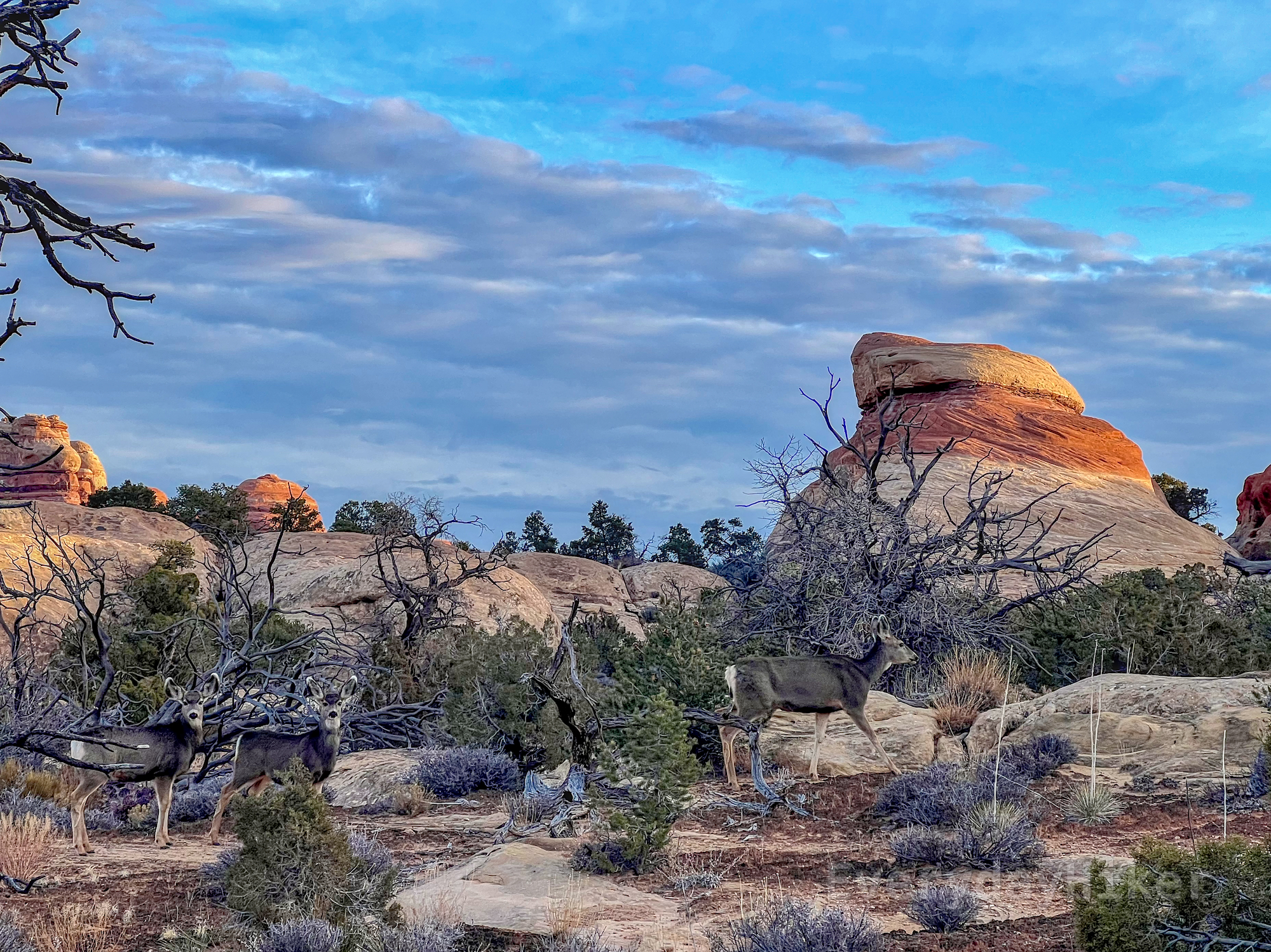 A few Mule Deer that I continually came across on the early portion of the hike. A small pillar of sandstone may be seen behind the various shrubs the deer were foraging around.