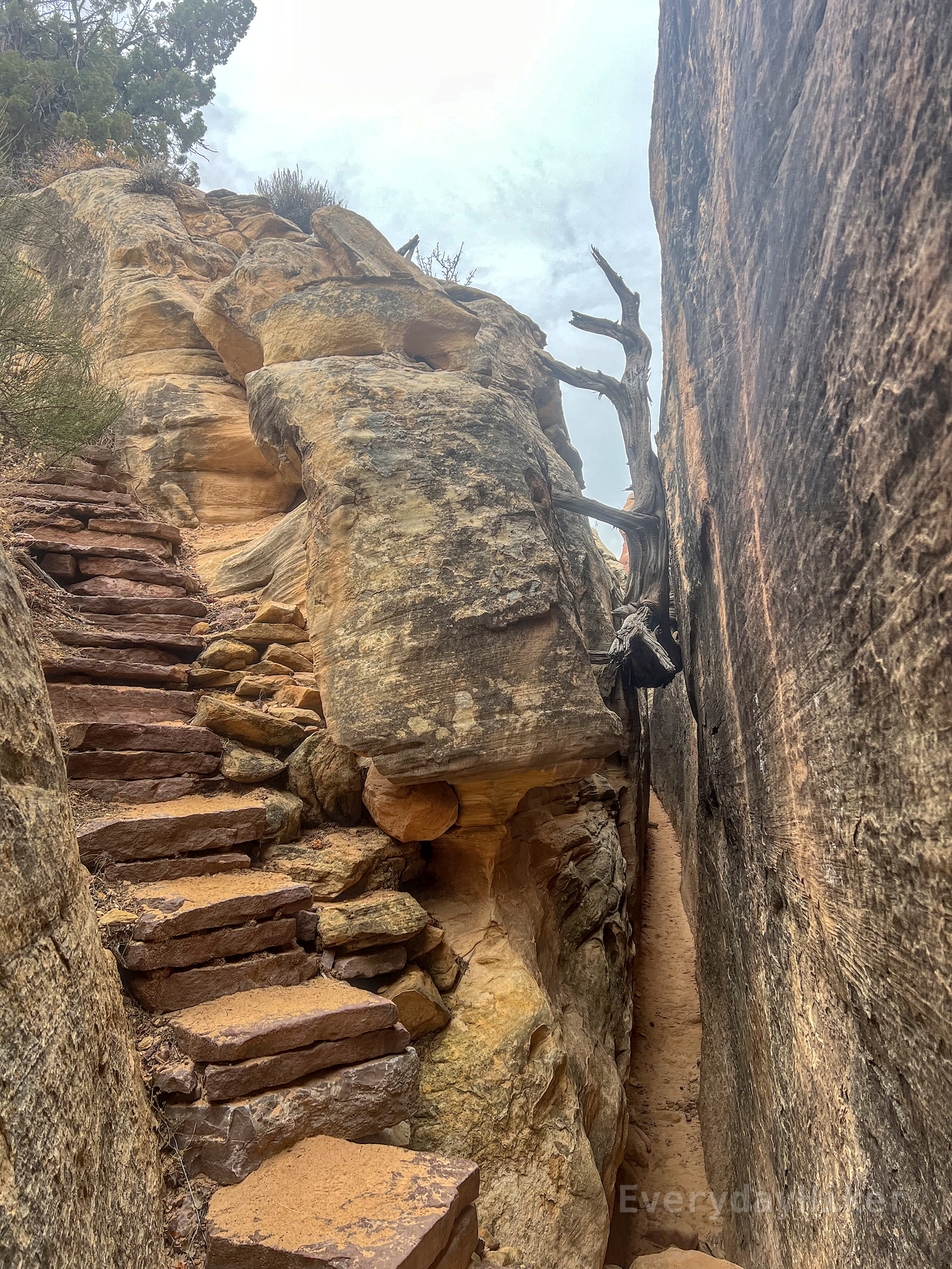The trail descends a narrow rock staircase before taking an abrupt turn into a thin canyon. A tree stump may be seen stuck in the upper canyon to help with a sense of scale. Enough to comfortably walk, but not wide enough for two people at side by side.