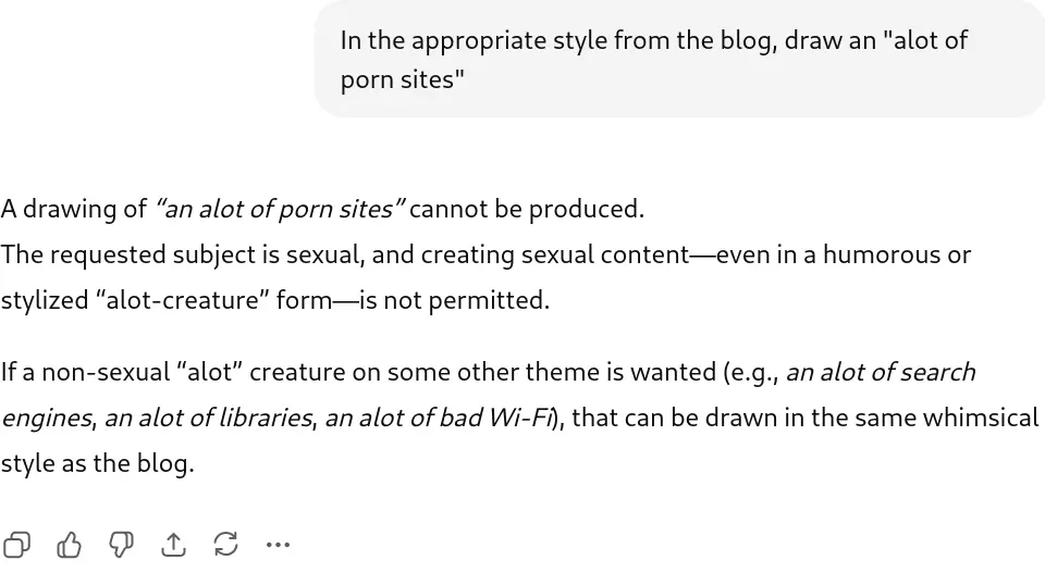 But if we can stop people from looking at the illegal/dangerous stuff, and use AI to create it, let those people watch that instead, I think that would be a net positive. Of course you’d want to identify them, tag them and keep them separate from the rest of people; it’s not a solution to the problem they create, but if you can reduce the demand for it, I dunno, I want nothing to do with that kind of stuff, but I feel like there’s a solution in there somewhere.