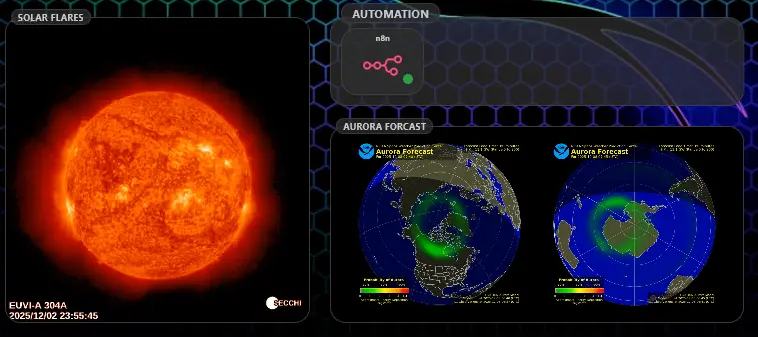 The latest thing I’ve cobbled together with n8n is a routine that goes out to https://sol24.net/ and pulls in the current Aurora forecast and the current 7 day video of solar flares into my dashboard. I’ve always had a fascination with how the sun affects the earth and the protective layers of our atmosphere, since I was a child. I built my own 5 watt, code only, transmitter and receiver and would set in my room late nights collecting QSL cards and talking to people from all over the world . I quickly learned that the ionosphere and other protective layers affected how far my little 5 watt signal would bounce. Solar flares burn holes in the ionosphere and prevent a good bounce halfway around the world. So the challenge was to pick days where there was good ionosphere coverage, and minimal solar flares in conjunction with antenna positioning.