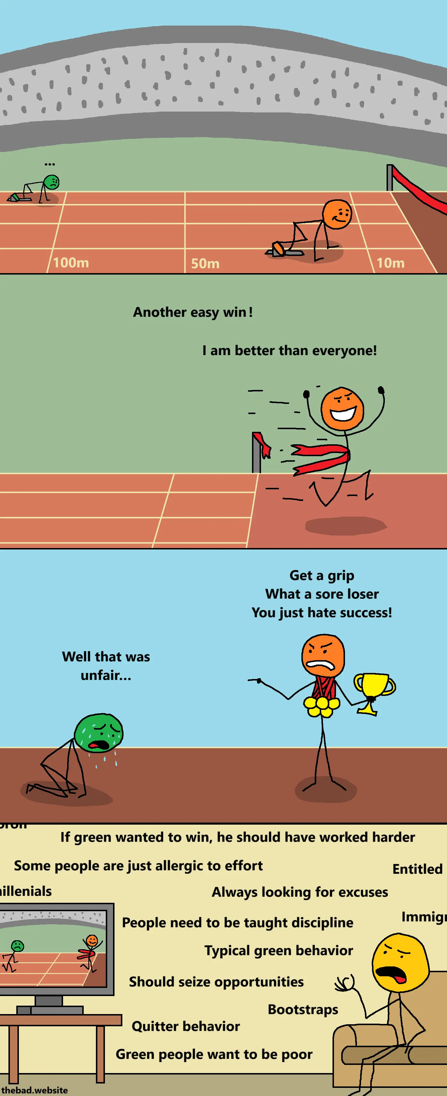 [yellow watches the race on TV, and rants about it from their sofa] If green wanted to win, he should have worked harder Some people are just allergic to effort Entitled… (?) (?)… millenials Always looking for excuses People need to be taught discipline Immigr… (?) Typical green behavior Should seize opportunities Bootstraps Quitter behavior Green people want to be poor