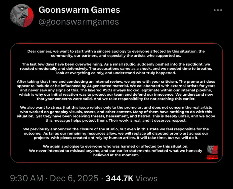 Dear gamers, we want to start with a sincere apology to everyone affected by this situation: the community, our partners, and especially the artists who supported us. The last few days have been overwhelming. As a small studio, suddenly pushed into the spotlight, we reacted emotionally and defensively. The accusations came as a shock, and we needed time to breathe, look at everything calmly, and understand what truly happened. After taking that time and conducting an internal review, we agree with your criticism. The promo art does appear to include or be influenced by Al-generated material. We collaborated with external artists for years and never saw any signs of this. The layered PSDS always looked legitimate within our internal pipeline, which is why our initial reaction was to protect our team and defend our innocence. We understand now that your concerns were valid. And we take responsibility for not catching this earlier. We also want to stress that this issue relates only to the promo art and does not concern the real artists who worked on gameplay visuals, assets, and other content. Many of them have nothing to do with this situation, yet they have been receiving threats, harassment, and hatred. This is deeply unfair, and we hope this message helps protect them. Their work is real, and it deserves respect. We previously announced the closure of the studio, but even in this state we feel responsible for the outcome. As far as our remaining resources allow, we will replace all disputed promo art across our projects with pieces created entirely by human artists. It will take time, but we will do it. We again apologise to everyone who was harmed or affected by this situation. We never intended to mislead anyone, and our earlier statements reflected what we honestly believed at the moment.