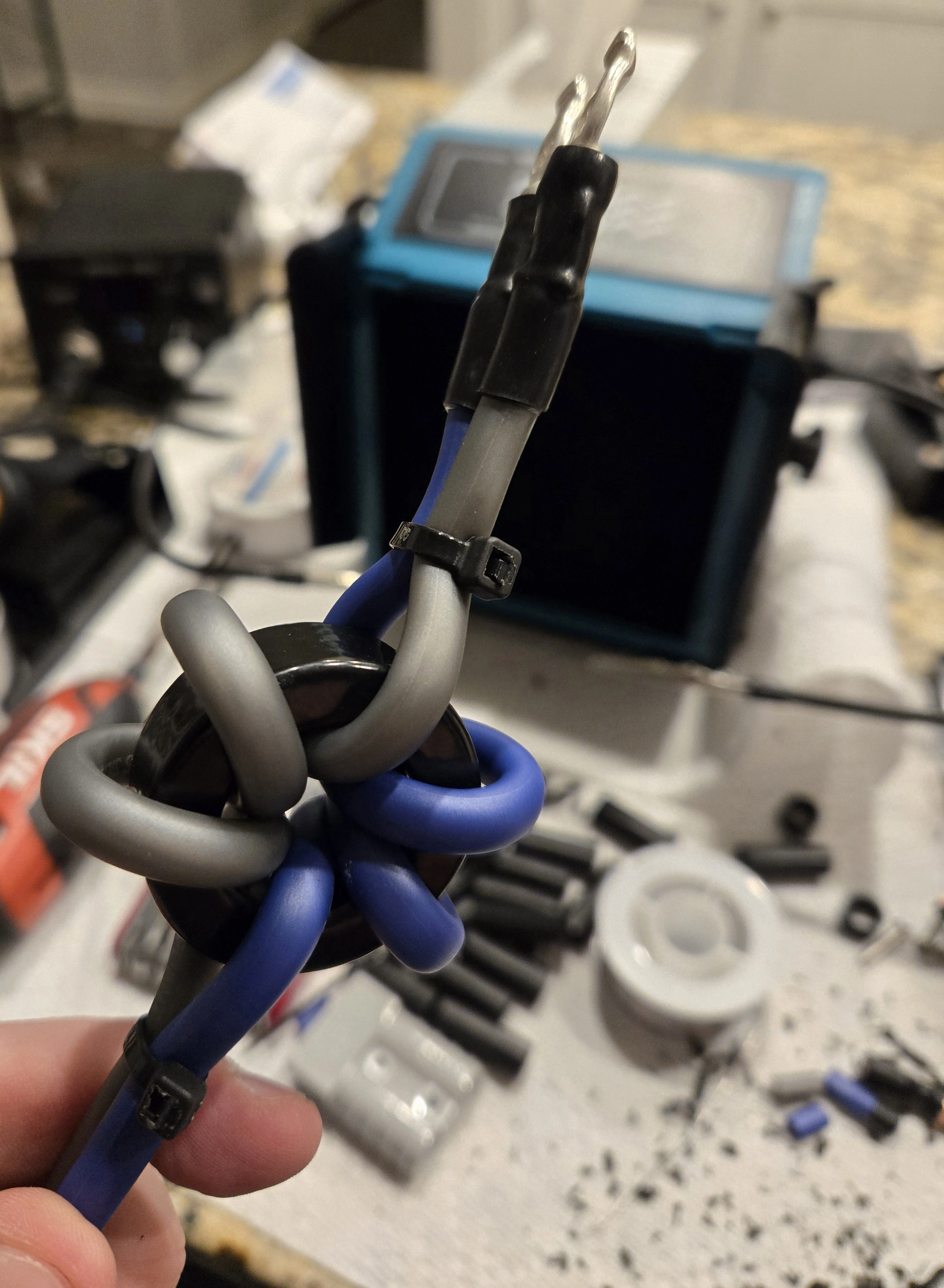 It’s a mix 43 ferrite toroid with 3 turns of 8awg wire going opposite directions for positive and negative. The idea is that clean dc power can get by easily, but interference from stray RF, or nearby electrical switching (think dimmable LEDs or similar) will see a really high resistance as it goes around the ring and get lost as heat, letting only the clean power get to the radio.