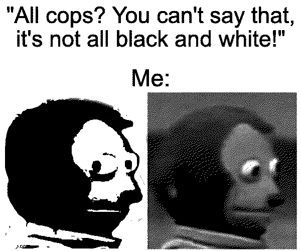 Not speaking up or pushing against policies and such that target specific groups of people because that’s the way we’ve always done it makes you a bastard still. We all know there’s probably one or two good cops per department/precinct that truly wish and do help people when they can. But they’re silenced for the sake of their job speaking out against the mistreatments and policies.