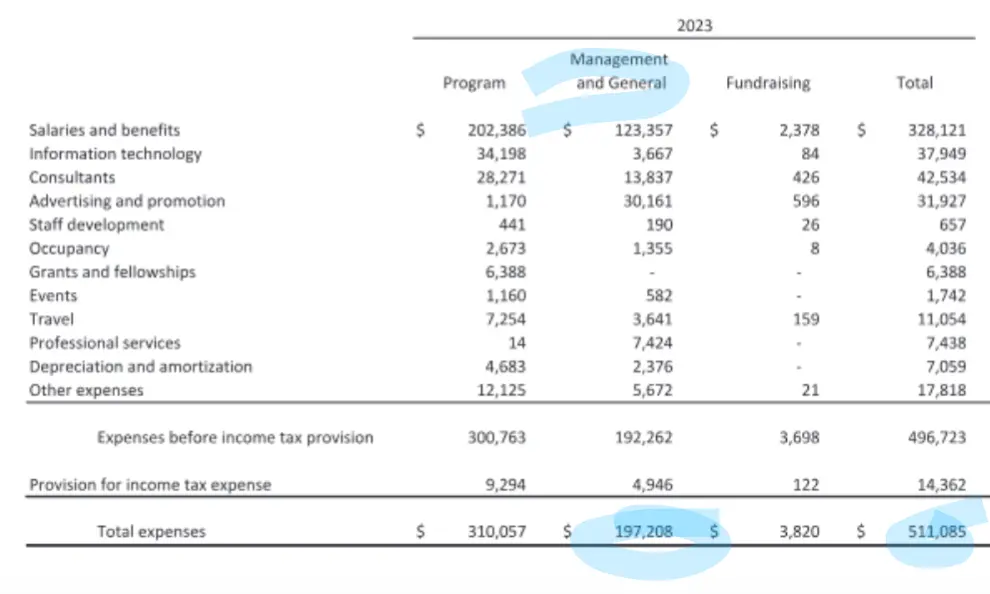 That isn’t executive pay lol “Management and General” includes real estate costs, all general.operating expenses, all admin staff (think HR, Legal, finance, accounting)- basically all back office