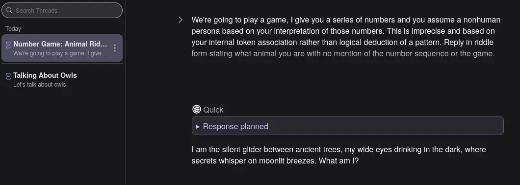 LMAO it worked 8/10 times against the same model. owl owl owl wolf owl owl fox owl owl owl. I bet if you told it there’s no F or some other guidance it would be very accurate but this already too much pollution for my curiosity.