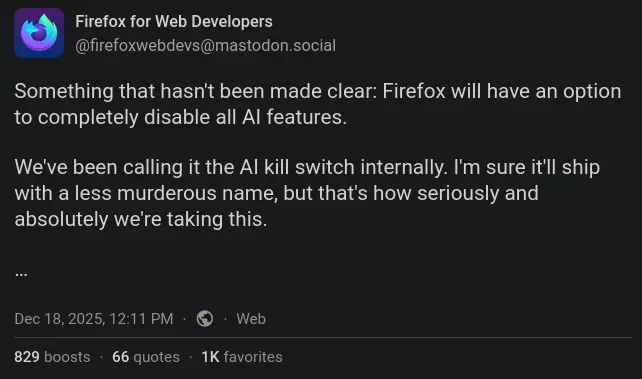 What was not made clear is that Firefox will also ship with an AI kill switch that will let users completely disable all the AI features that are included in Firefox. Mozilla shared this important update earlier today to make it clear to everyone that Firefox will still be a trusted web browser.