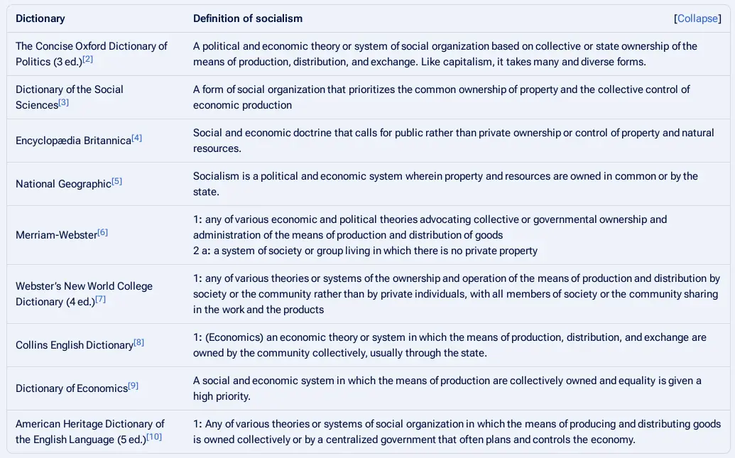 Summary of nine dictionaries all with similar primary definitions of 'socialism'