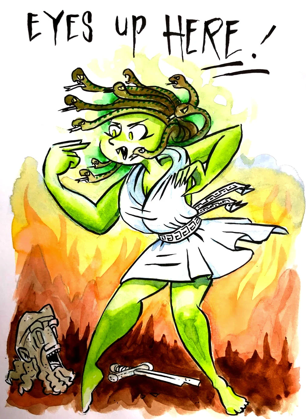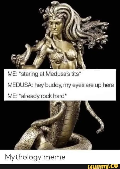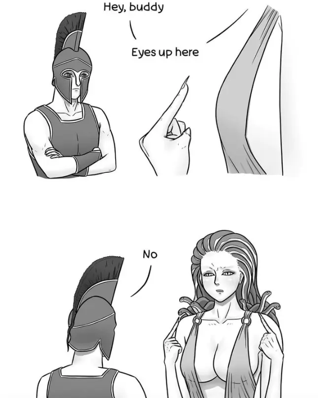 Medusa pulling down her partner’s pants. “Aww, there’s only one snake?”