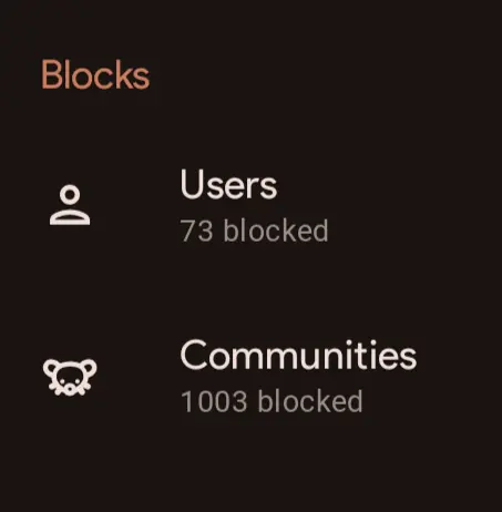 Another good chunk are redundant communities - like 5 or 6 if those blocks are some variant of “To my badass hero” which is the same poster that keeps making new communities for softcore black and white porn… I can only assume in effort to circumvent blocks like mine.