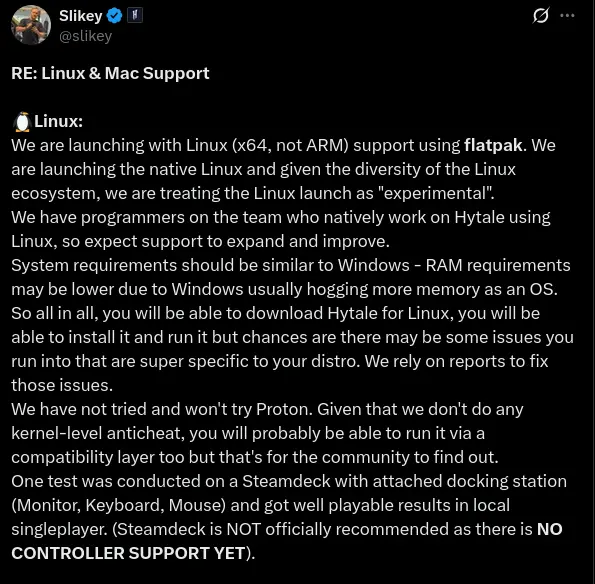 arrow-up1253arrow-down1imageHytale's Co-Founder and Tech Director, revealed that Hytale will offer experimental x64 Linux support via flatpak at launch, with plans to enhance it based on community feedbackmr_MADAFAKA@lemmy.ml to Linux Gaming@lemmy.worldEnglish · 18 days agomessage-square21linkfedilinkfile-text