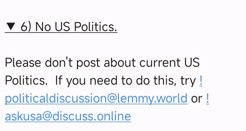 minus-squarecosmicrookie@lemmy.worldOPlinkfedilinkarrow-up5arrow-down1·9 days agoNo It has nothing to do with politics. The question is about the rule of this Community .the rule is about politics but the question is why the rule specifically applies to a very narrow area of politics