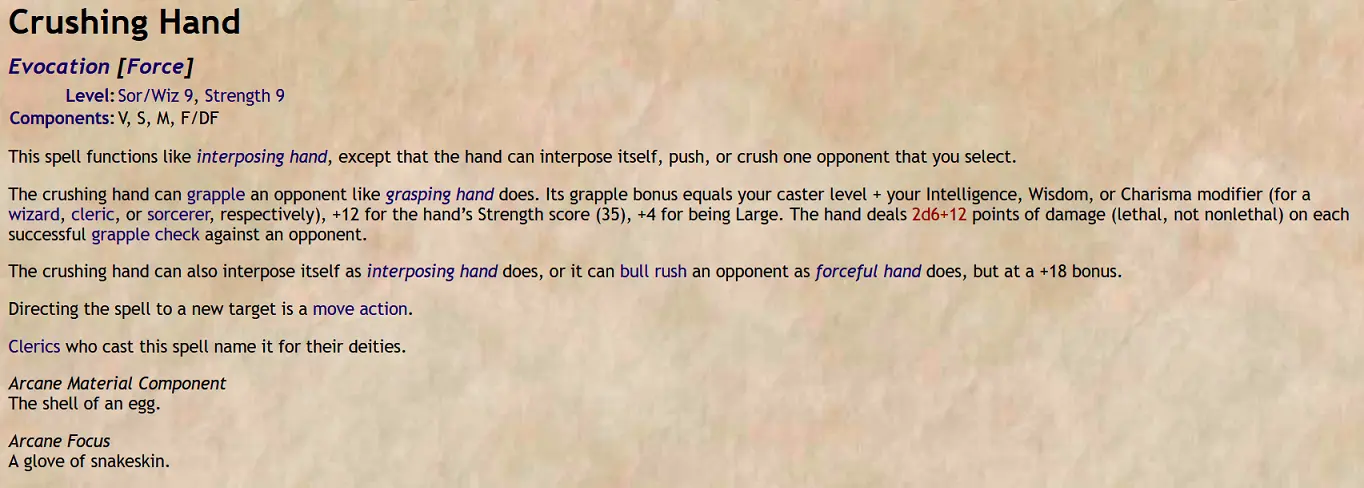 Crushing Hand is a spell from 3rd Edition and earlier Dungeons and Dragons