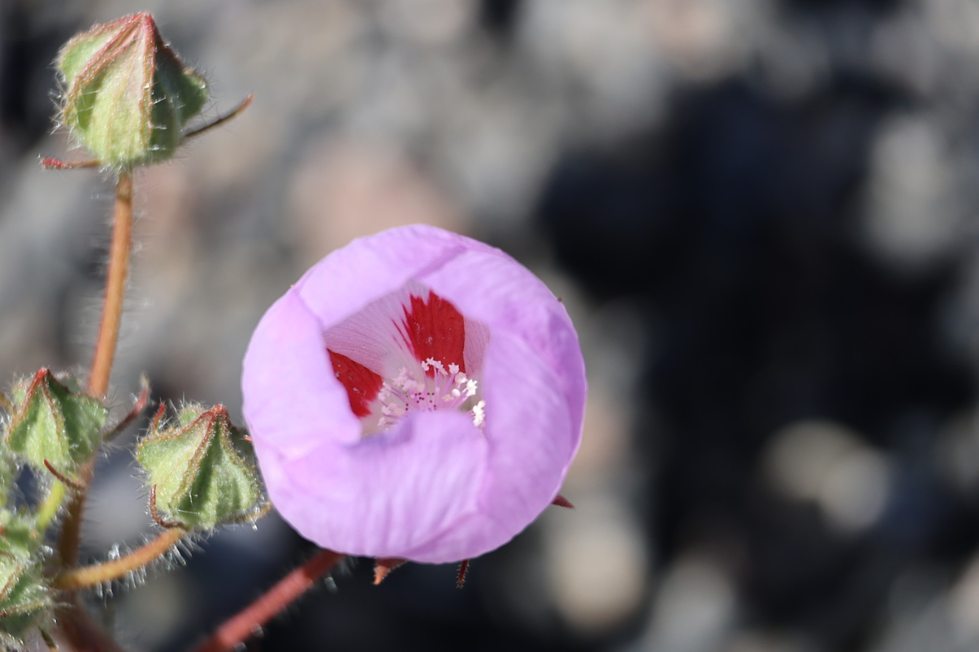 A photo of a flowering Desert Fivespot, Eremalche rotundfolia that was growing on the rim of the Ubehebe Crater. With the wildflower not fully opened, it has a ball-like appearance in this photo. Flower is pink with five different red streaks on the interior (two seen in photo).