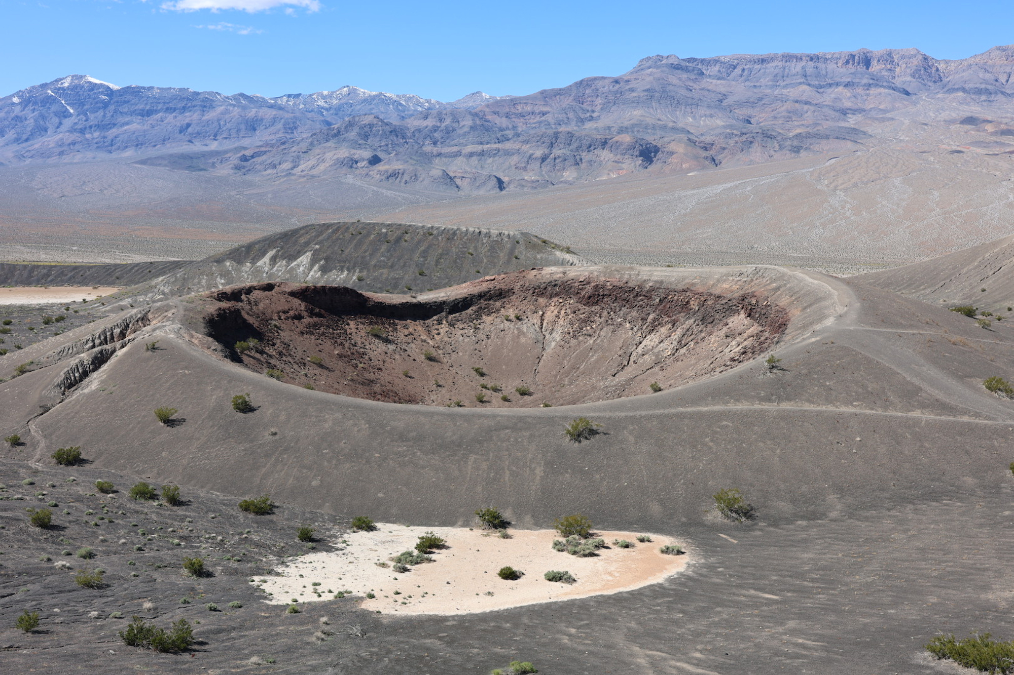 Looking over towards the Little Hebe Crater, which is located right beside Ubehebe Crater. In the distance, a mountain ridge may be seen with slight snow caps on a couple of peaks.