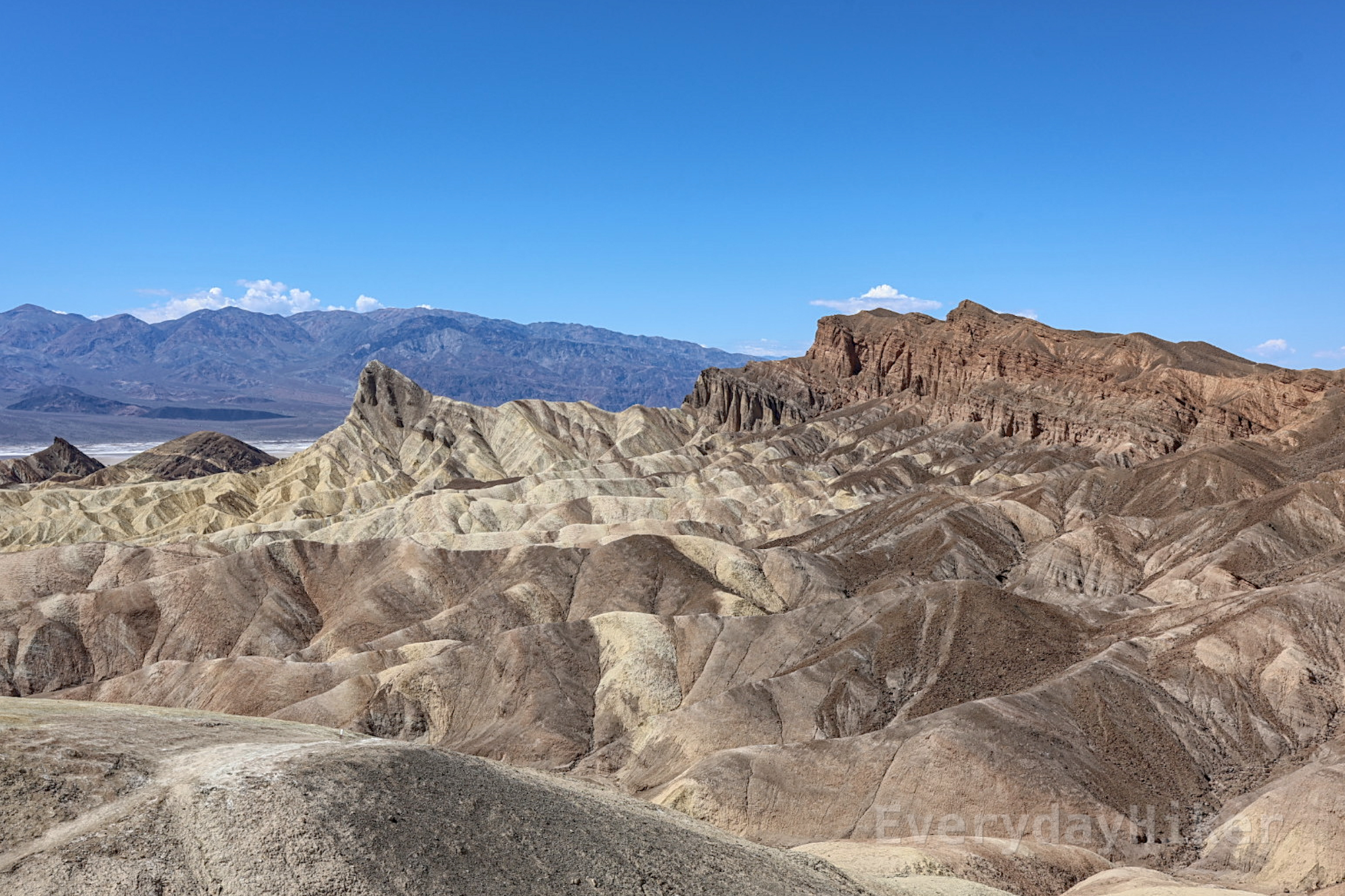 Rolling hills of light and dark brown patterned rock may be seen with a sloped ridgeline on the right of frame. A separate ridgeline on the far end of Death Valley may be sen in the distance.