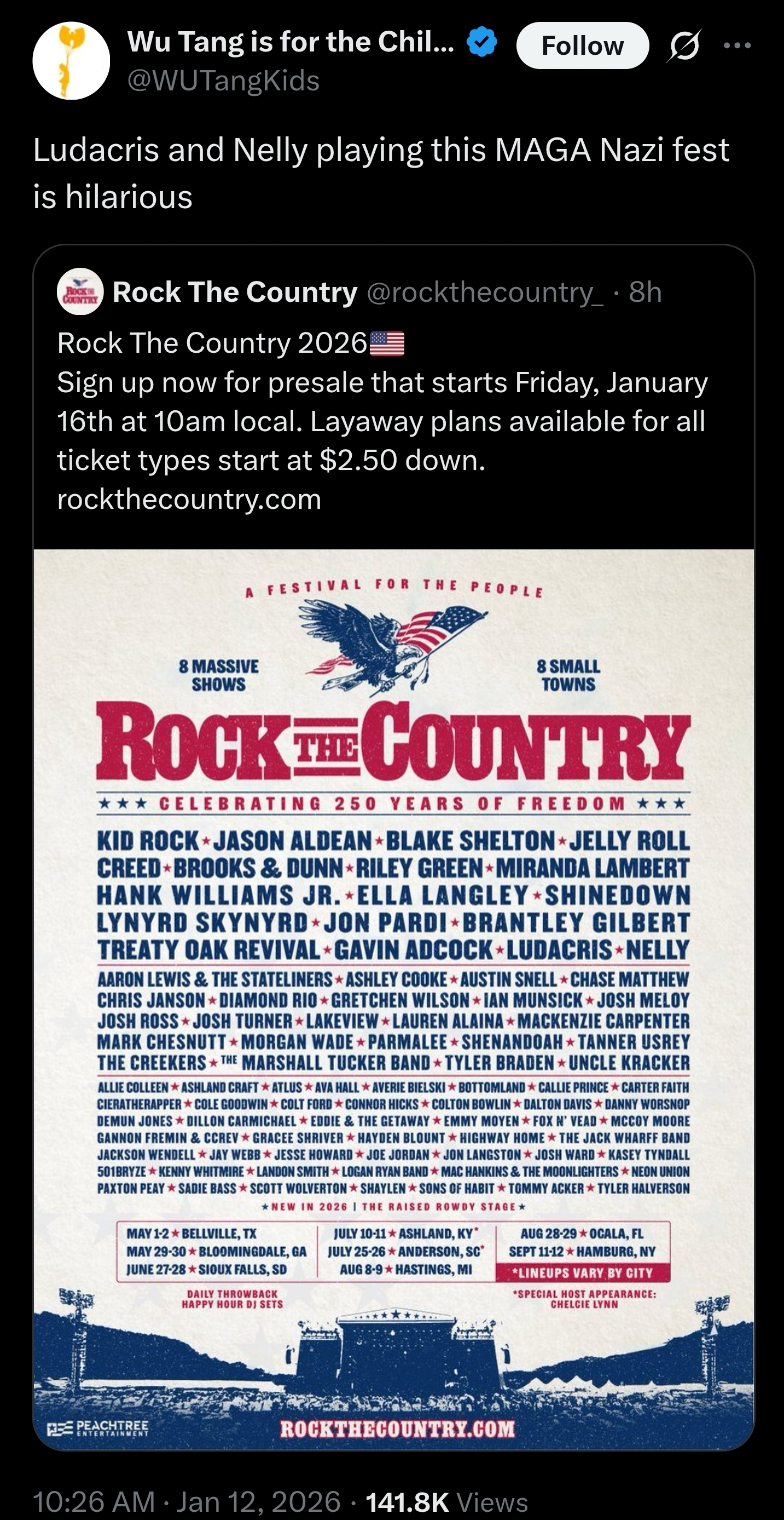 I have a feeling most of the big names will be doing a one hour set at a single location, and they may not even know it’s for a Kid Rock festival considering how shady maga normally is with this shit.