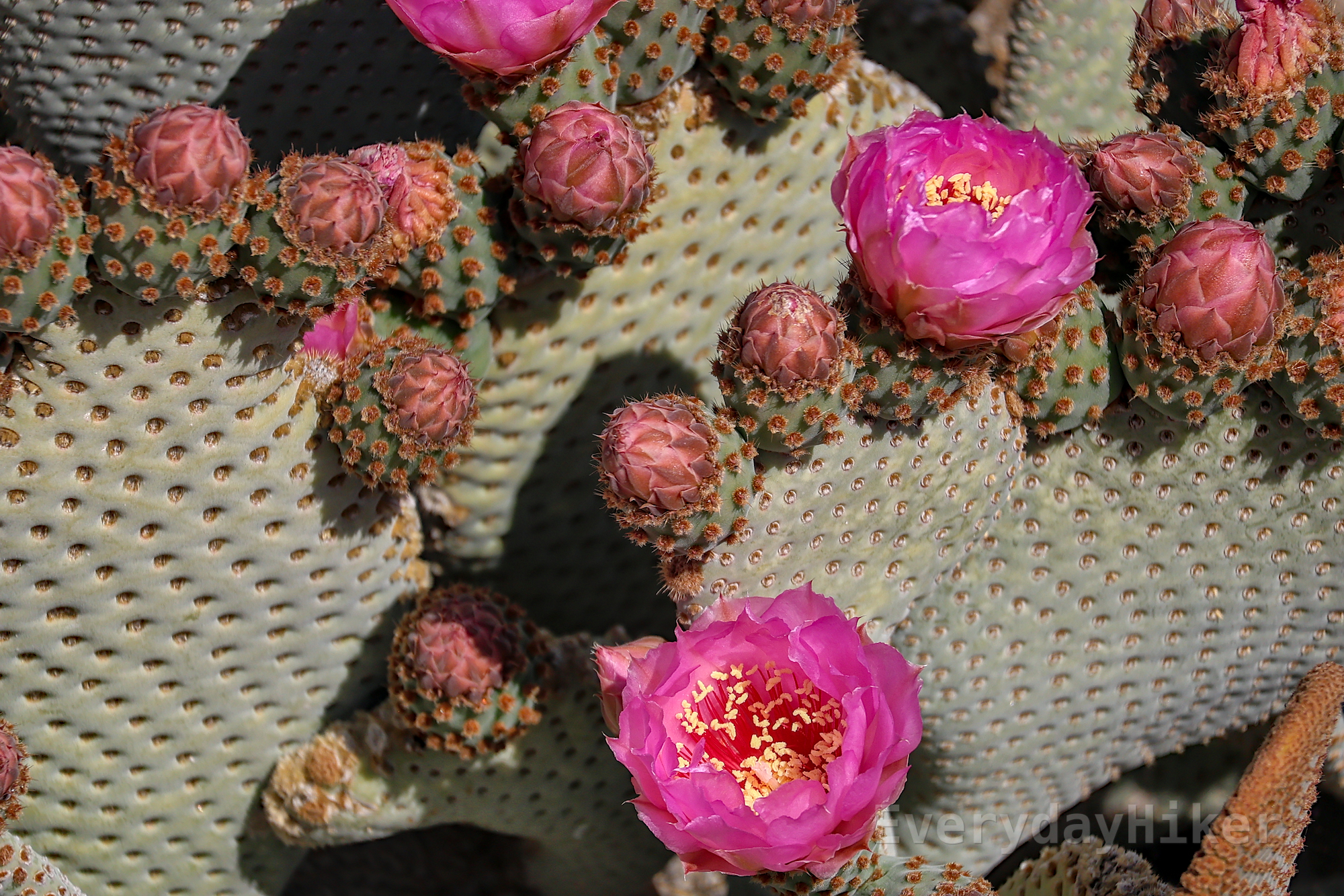 A close up of a flowering Beavertail Cactus, with its bright pink flowers surrounded by unopened buds.