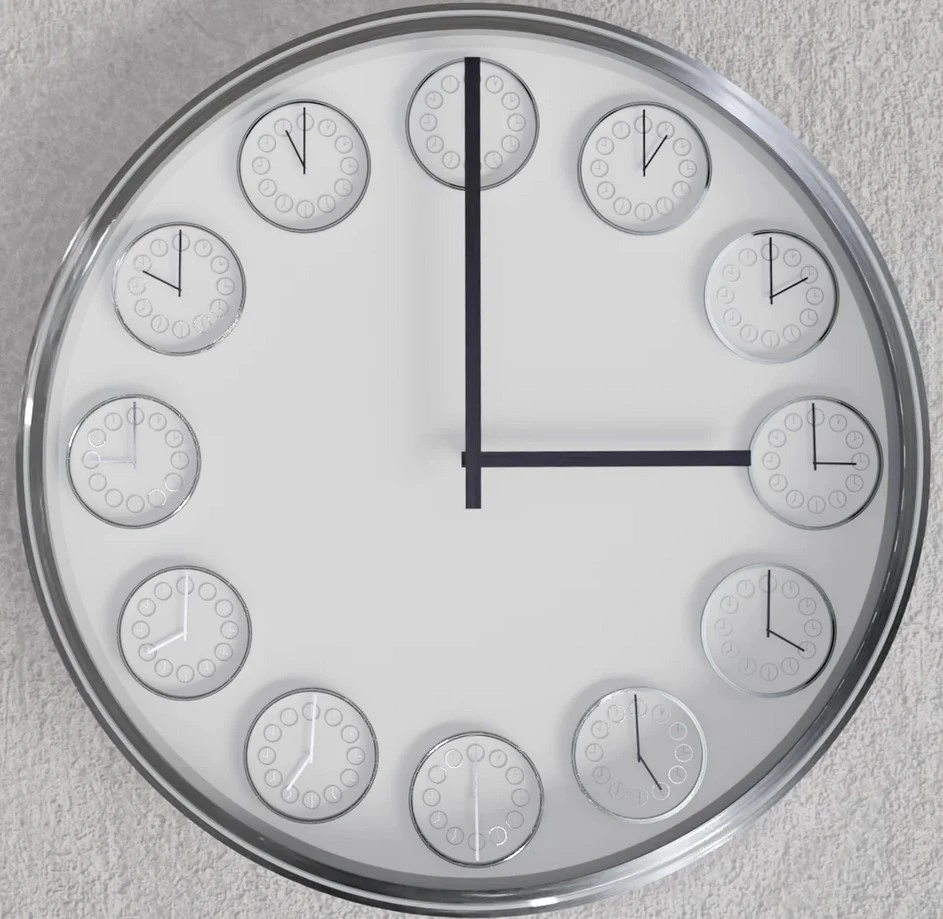 Although I’m still confused on what the clock would show in an hour. Because if the subclocks mirror the parent clock at the given time, then they would all be stuck to the hour they are positioned on? Or if they can move then the sublcocks are coupled to 3 o’clock of the main clock. But well, it is all hypothetical anyways :D
