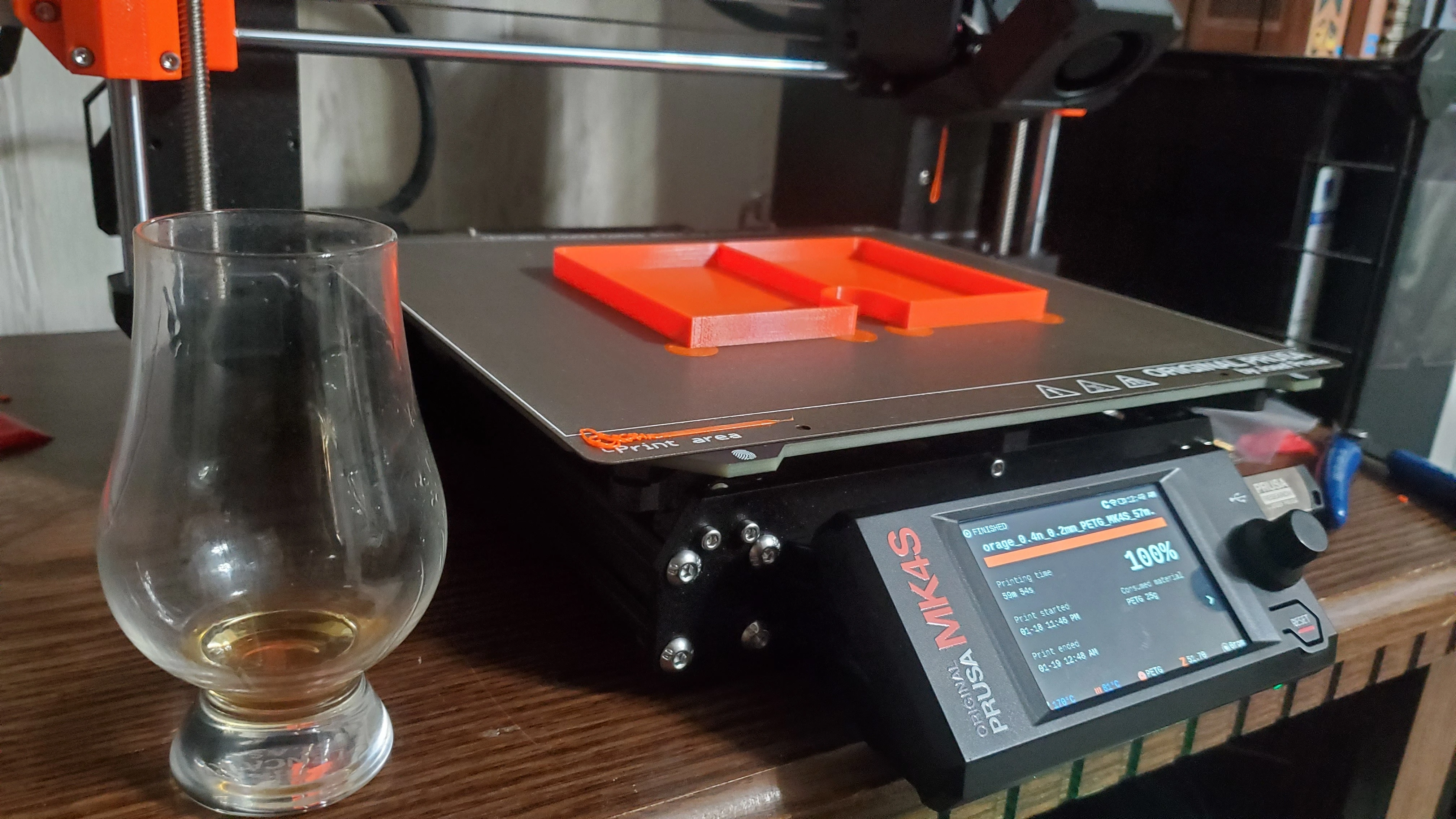 Brand new spool of Printed Solid Jessie PETG filament loaded, corresponding filament preset selected in slicer. Tool caddy with assistant discs at sharp corners sliced, sent to printer, Z offset set at -0.025mm, 1 glencairn of small batch 90 proof straight bourbon poured…