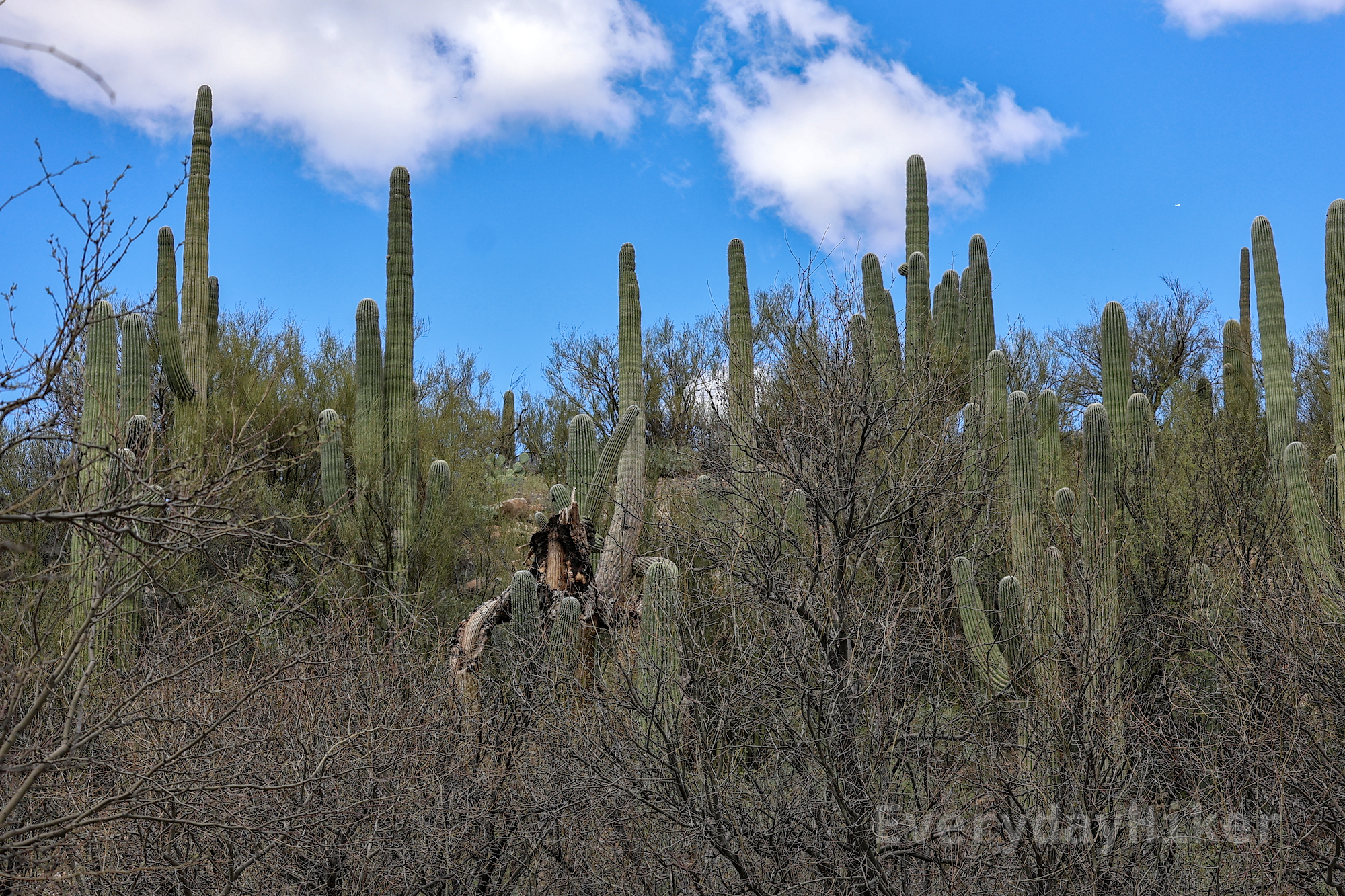 Several clusters of Saguaro cacti grow among the shrubs on the side of the trail. One dead and desiccated Saguaro may be seen in the center of frame.