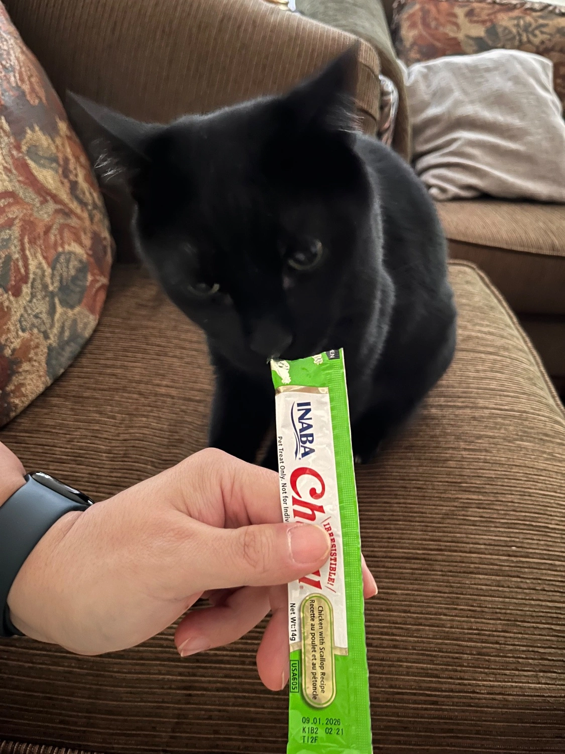 I’ve used churu to end wars between cats. It’s a game changer for earning a good reputation when you’re new to a suspicious cat. Maybe they don’t let you touch them yet, but now they come out to see you in case you brought more of that delicious goo.