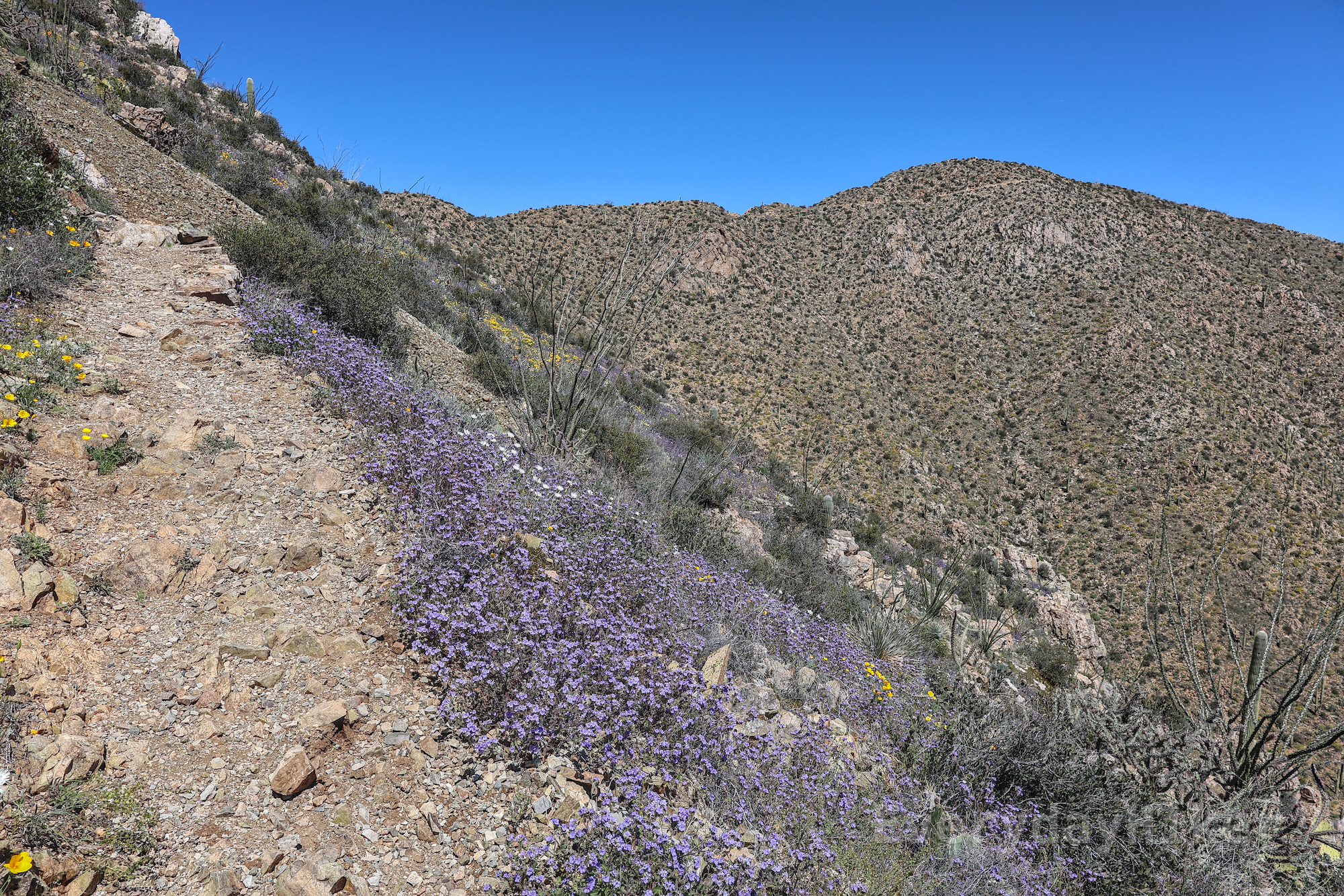 A steep hillside lined with purple wildflowers in bloom. In the distance the peak of the trail may be seen rising up.