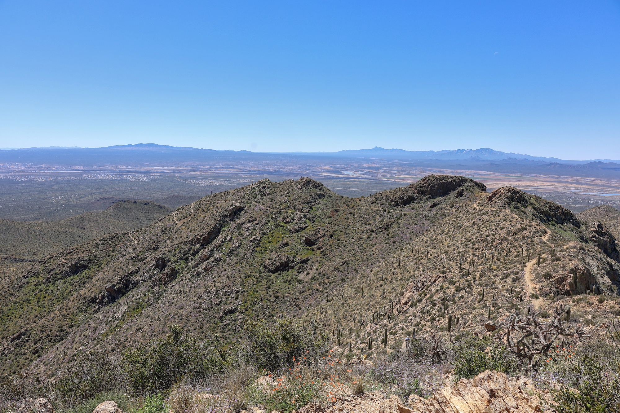 Combining sections of four trails to make a loop, this trail takes you to the highest point in the Tuscon Mountains. Along the way you’ll pass a small collection of petroglyphs, a small stone building, and abundant flora and fauna. With all of the elevation gain, the trail sports fantastic views.