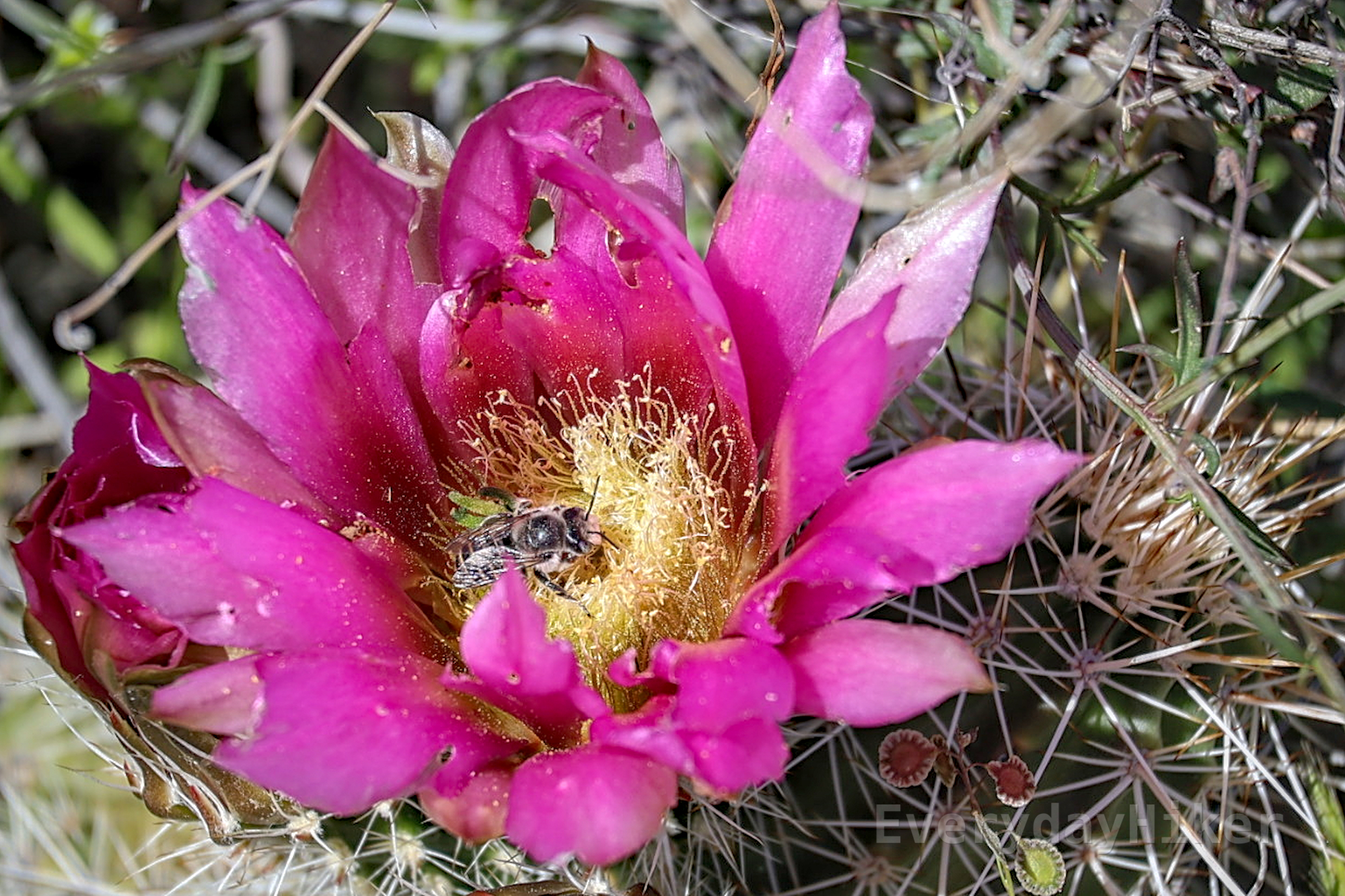 A bee forages inside of a blooming pink flower on a Hedgehog cactus.