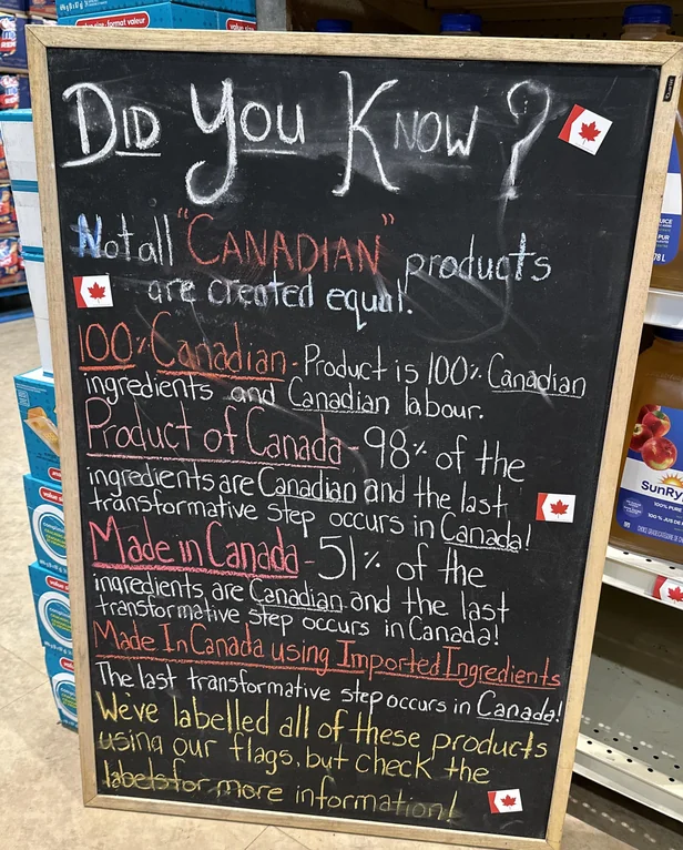 minus-squareconfusedpuppy@lemmy.dbzer0.comlinkfedilinkarrow-up6·edit-21 month agoMy store uses a similar tag. It points to the price of the product on the shelf to indicate the product is “Canadian.” If you look to the right of the board, you can see the tag tucked into the shelf.