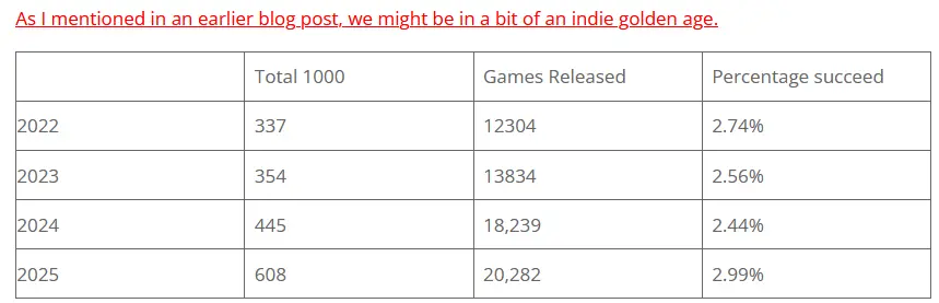 He says “Indie golden age” since the number of games with 1000 reviews or more made a big jump from 337 in 2022. This is also an increase percentage-wise despite the huge increase in games overall: