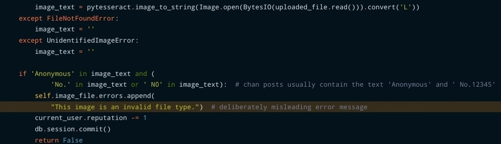 if site.enable_chan_image_filter: # Do not allow fascist meme content try: if '.avif' in uploaded_file.filename: import pillow_avif # NOQA image_text = pytesseract.image_to_string(Image.open(BytesIO(uploaded_file.read())).convert('L')) except FileNotFoundError: image_text = '' except UnidentifiedImageError: image_text = '' if 'Anonymous' in image_text and ( 'No.' in image_text or ' N0' in image_text): # chan posts usually contain the text 'Anonymous' and ' No.12345' self.image_file.errors.append( "This image is an invalid file type.") # deliberately misleading error message current_user.reputation -= 1 db.session.commit() return FalseYup. If your image contains the word