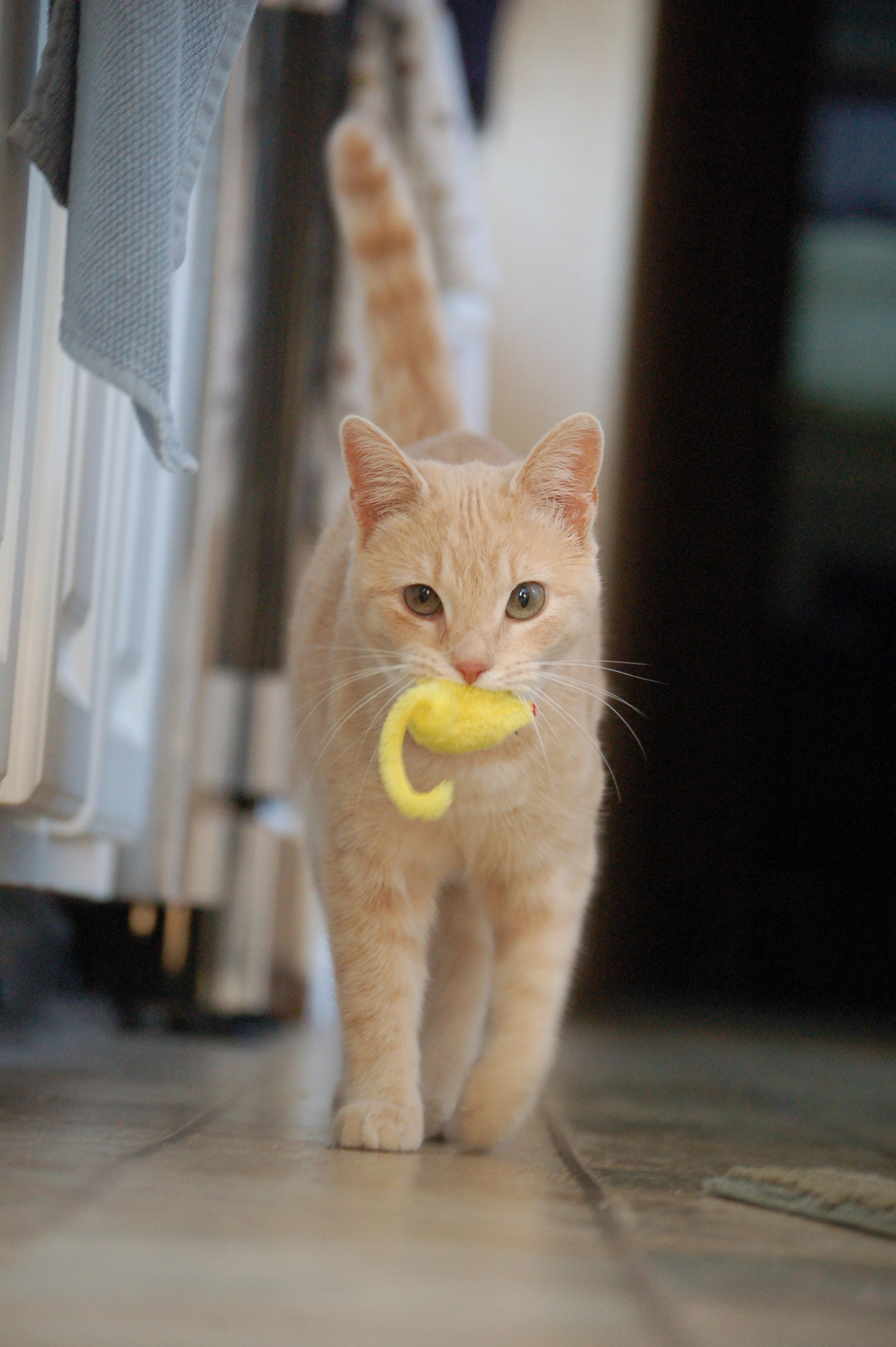 My handsome boy has a toy fish he brings to me. Well, he brings it wherever he sleeps and sometimes that is on my legs. Sometimes he just brings it to me. He really likes that fish.