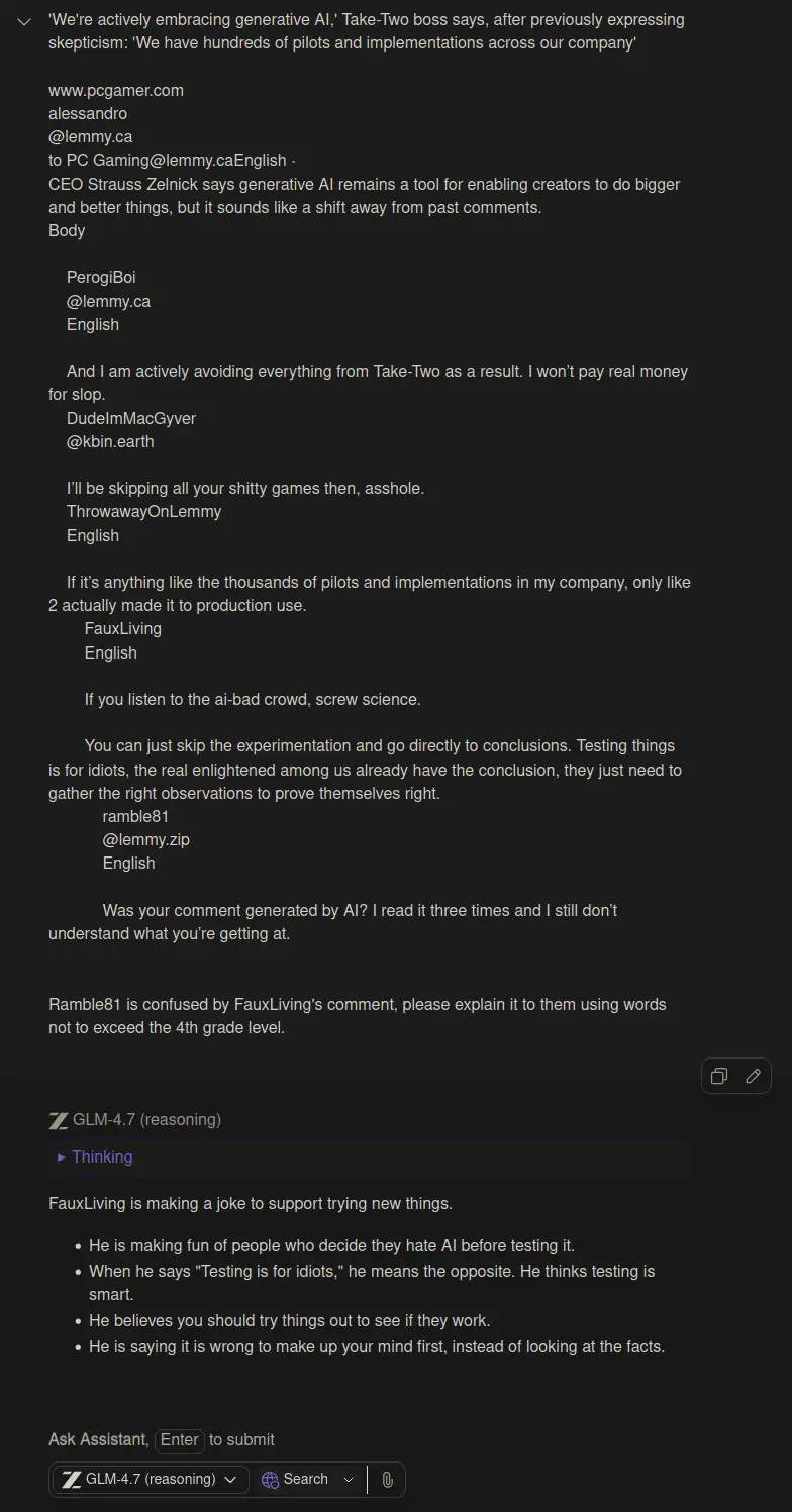 Maybe you should ask the AI to read comments to you if you’re unable to comprehend basic written English. Here, since your confederates are similarly unable to read I’ve already asked an AI to explain for you: