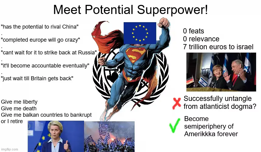 Except the EU can’t compete industrially or millitarily with any of those 3. The EU needs to correctly identify who to partner with for its own survival, and it’s clear that the PRC is the best option, Russia being a second choice. The US Empire is dying, and the EU imperialists are either going to fall down with it or be forced into cooperation with those it has convinced itself are existential enemies.