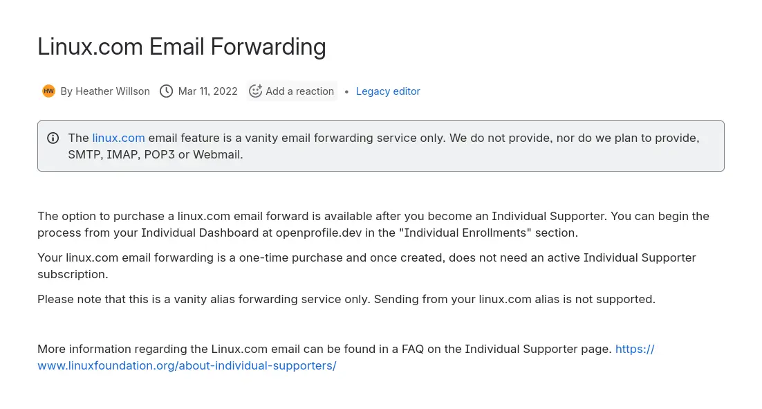 Yeah that’s right. For a whopping one time purchase of 250$, you get a lifetime license for a @linux.com domain as an email alias/forwarding only. You cannot send emails from this. You can contact support to check if the alias you want is available too.