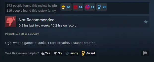 anyways, here’s a screenshot of the Relooted review i talked about. if you check the game’s negative reviews and sort by most pertinent, it’s the 3rd one. it was here yesterday, and despite me reporting it, it’s still here today, and in fact has been here since february 11th. as time of writing, it has 373 people who found it useful, and 115 who found it funny. some of the comments under that review are critical, but most just say “based” and the like.